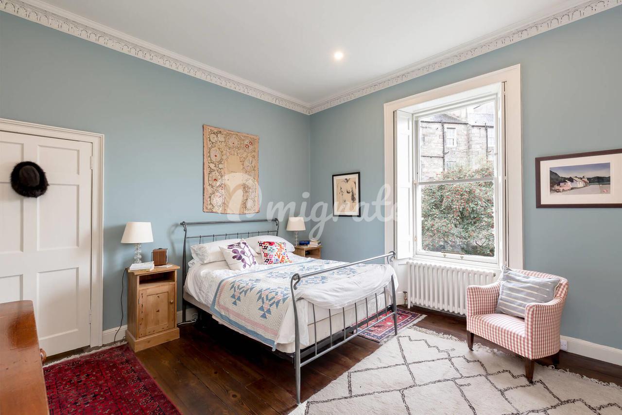 Дальнейшее жилое и развлекательное пространство обеспечивается гостиной, расположенной впереди на первом этаже. Это потрясающее помещение, залитое естественным светом благодаря двум створчатым и витражным окнам. Помимо деталей периода, нынешние владельцы добавили сделанные на заказ столярные изделия, в том числе книжные полки и дополнительное место для шкафа. Хотя эта комната хорошо работает как приемная, при необходимости ее также можно использовать как большую спальню. В задней части дома находится главная спальня и безупречная семейная ванная комната.