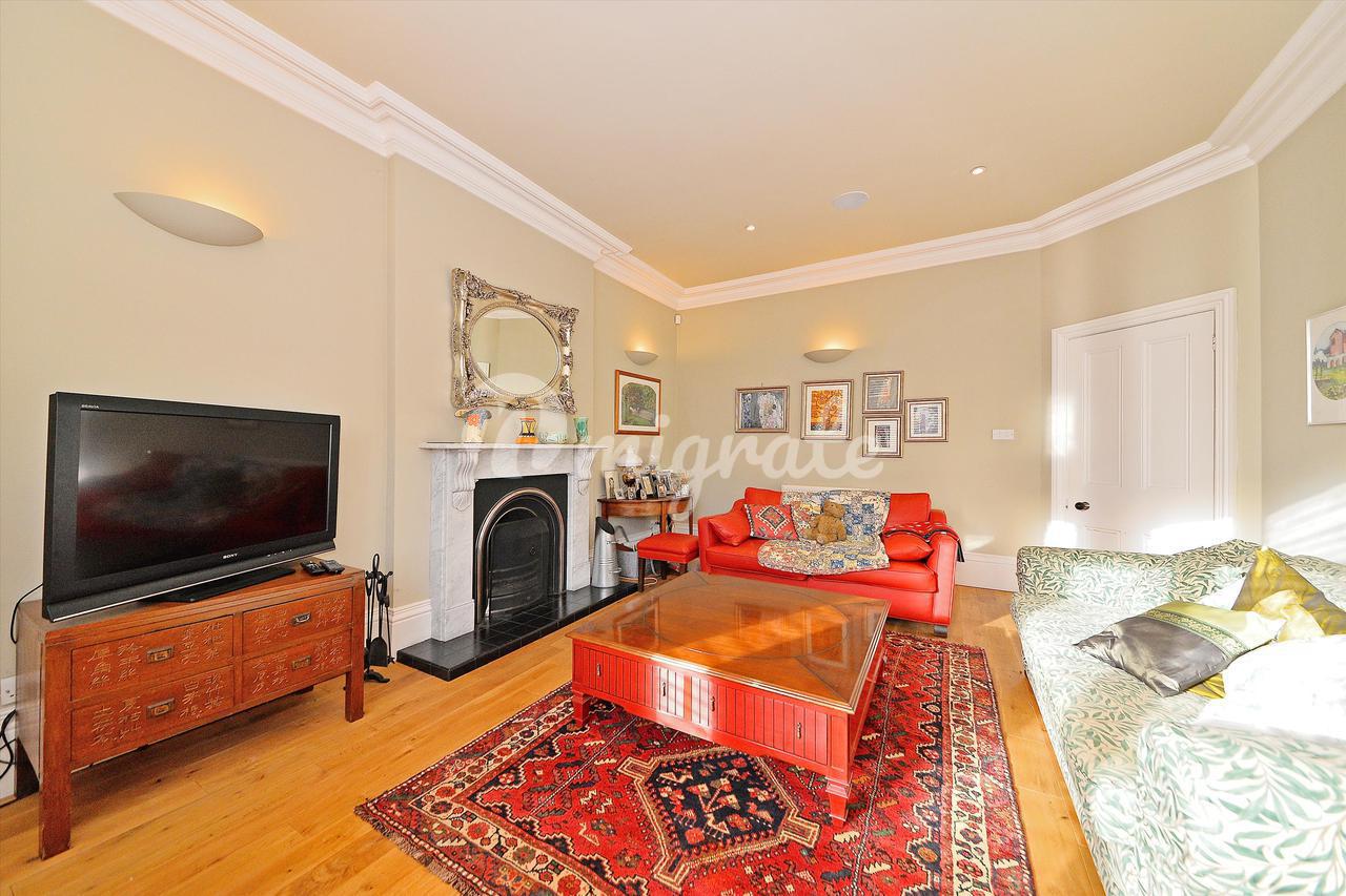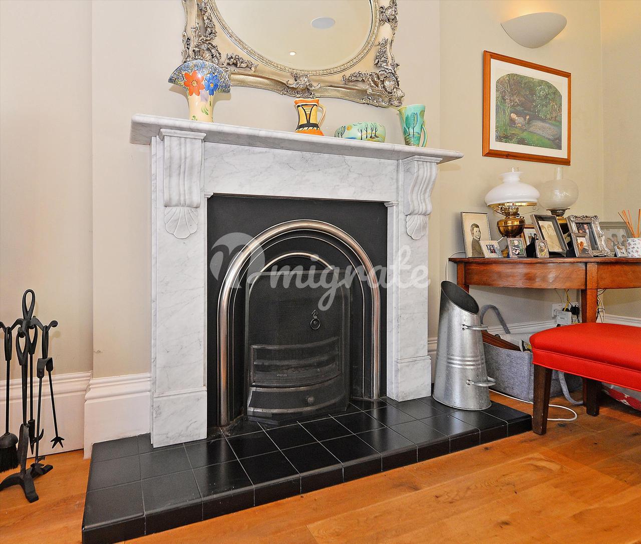 Гостиная, также расположенная в передней части дома, в настоящее время используется в качестве кабинета. Здесь есть прекрасный прямоугольный эркер, обеспечивающий достаточно света, и прекрасный открытый камин, отделанный бледным мрамором.