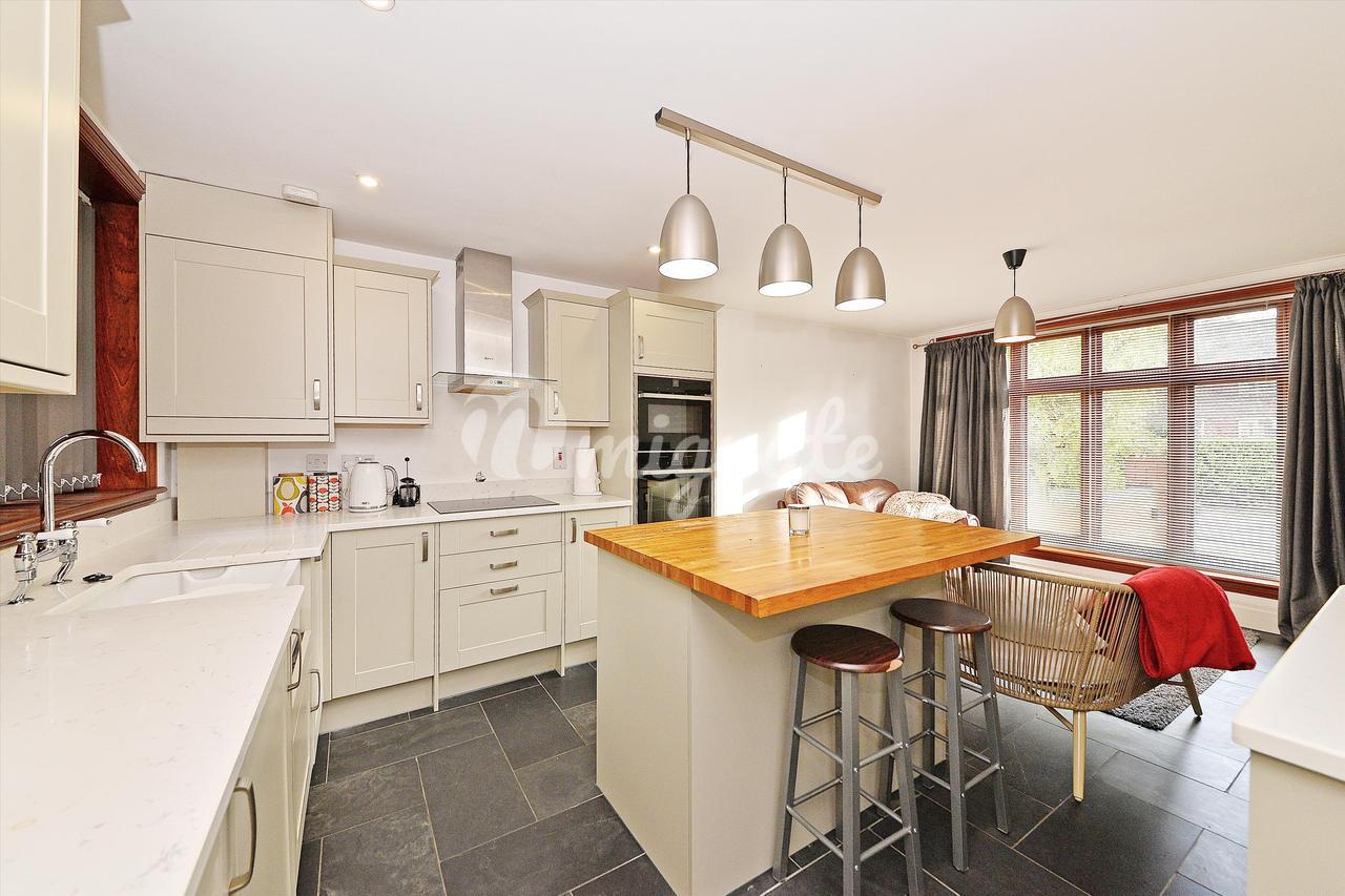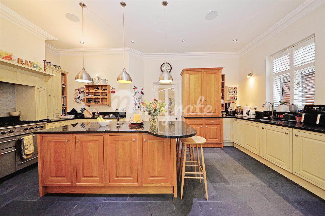 Большая кухня хорошо оборудована широким ассортиментом напольных приборов с рабочими поверхностями из темного гранита. Превосходный центральный островок обеспечивает дополнительное пространство для хранения и приготовления пищи, а барная стойка в одном конце идеально подходит для неформального ужина. По соседству есть отдельное подсобное помещение / прачечная с местом для более крупной бытовой техники.