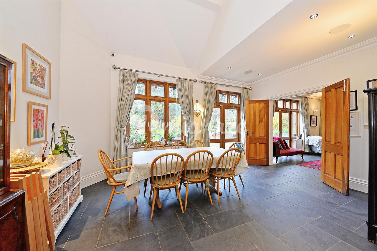 Светлое и блистательное, это великолепное пространство перетекает в столовую. Высокий потолок создает реальное ощущение пространства. Залитое естественным светом окно и французские двери ведут на террасу заднего дворика, откуда открывается прекрасный вид на сад. Двойные двери ведут в чудесную семейную комнату.