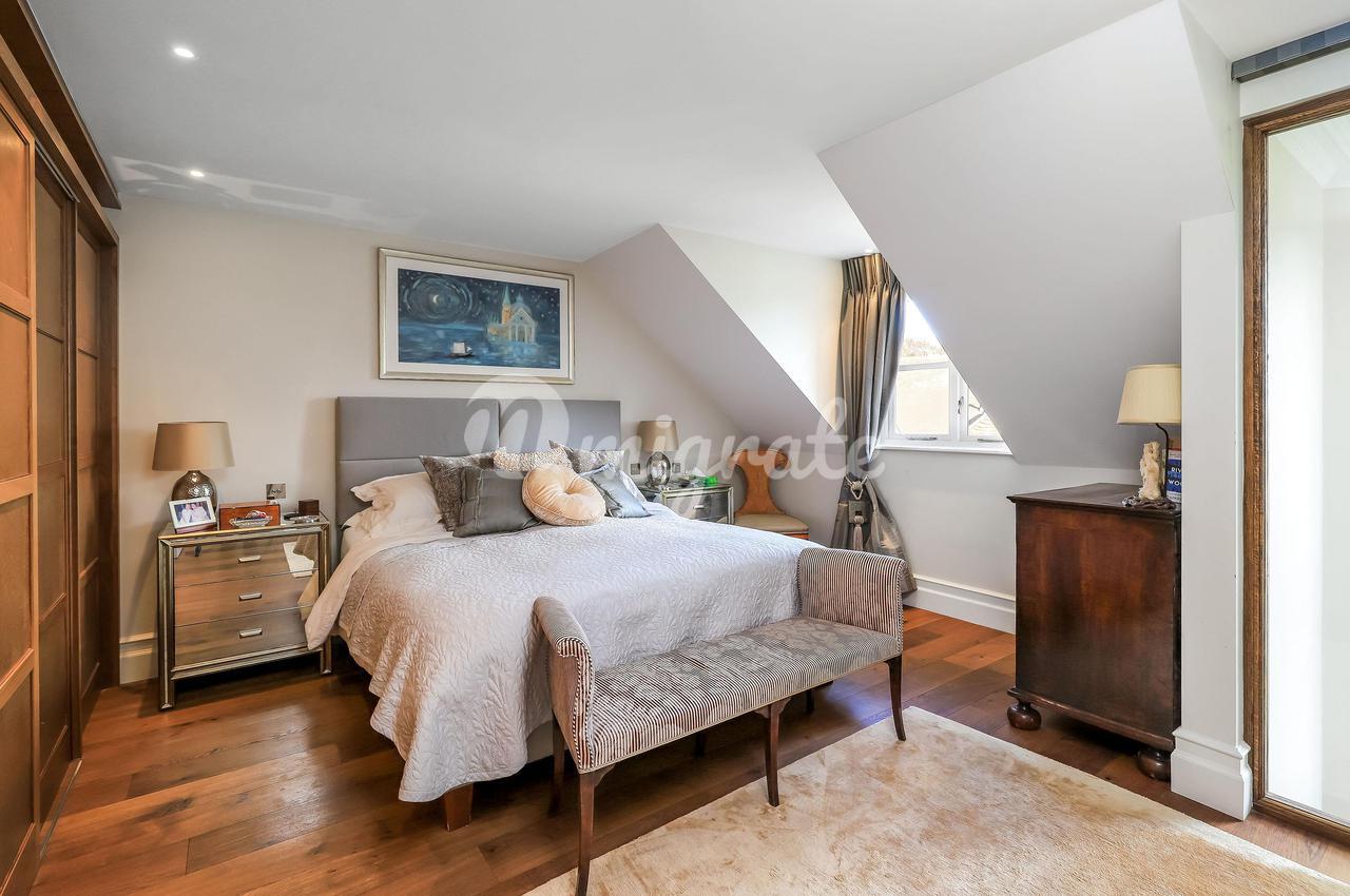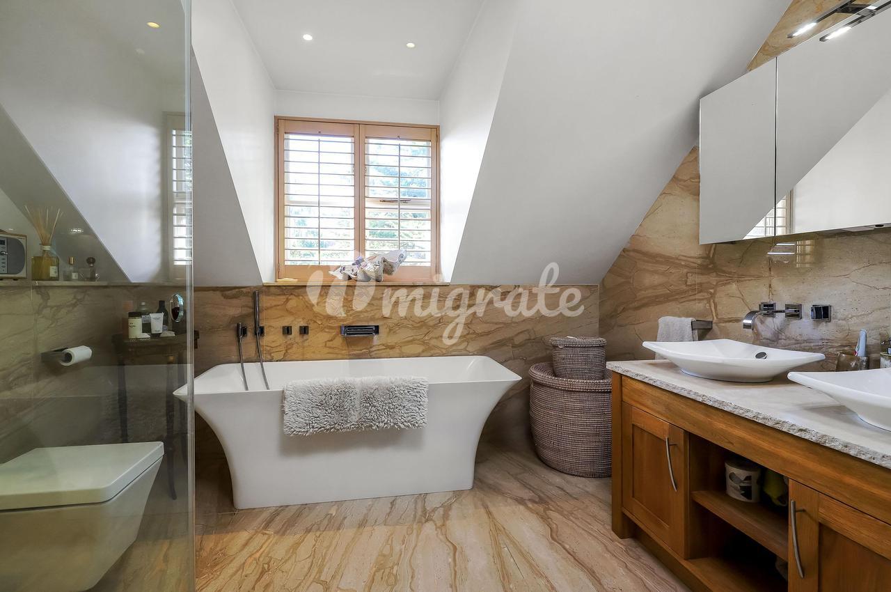 Входная дверь из цельного дуба ведет в гостеприимный холл с каменным полом и лестницей из белого известняка с железной балюстрадой, сделанной на заказ. Двойные двери ведут в уютную комнату со встроенными полками и шкафами для аудио- и видеооборудования. Застекленная дверь ведет в сад. На первом этаже есть гостевая спальня с ванной комнатой, а также подсобное помещение, гардеробная и встроенный двухуровневый гараж (с сушильной комнатой). На лестнице есть двойное окно с видом на сад и окрестности. Великолепная гостиная с центральным газовым камином с каменной кладкой и застекленными раздвижными дверями на веранду. Рядом с передней частью дома находится учебная зона с впечатляющим арочным окном. Г-образная кухня/комната для завтрака с видом на переднюю и заднюю часть дома была спроектирована Марком Уилкинсоном. Существует ряд встроенных приборов, включая холодильник Sub-Zero, отдельный винный холодильник, две духовки Miele с вентилятором, микроволновую печь, ящик для подогрева, пароварку под давлением и посудомоечную машину. На втором этаже главная спальня имеет гардеробную и роскошную ванную/душевую комнату. Есть еще две спальни и семейная душевая. Лестница ведет на мансарду третьего этажа.
