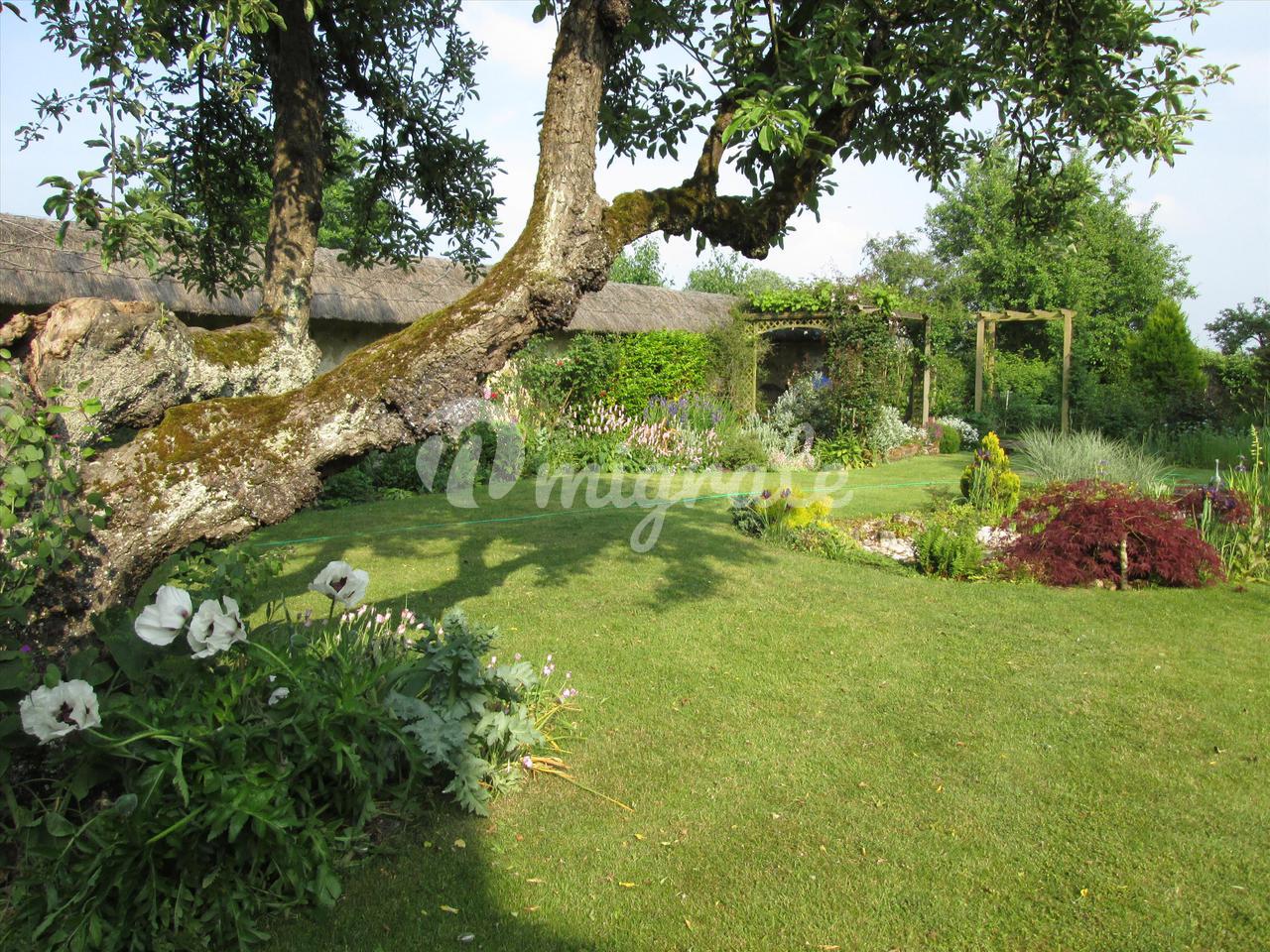 Есть крытая беседка, декоративный пруд, мастерская и сарай/склад дров. За фруктовой клеткой в конце сада открывается прекрасный вид на соседние поля.