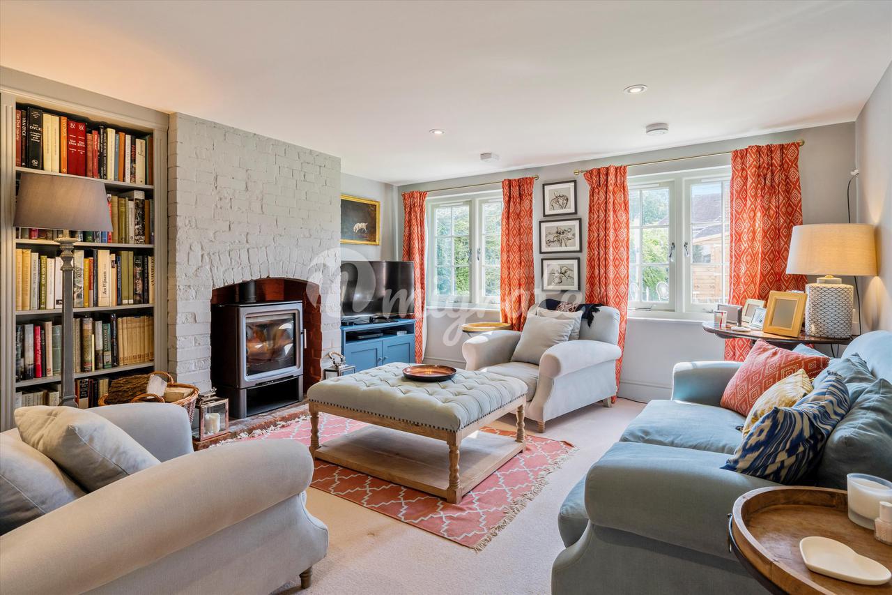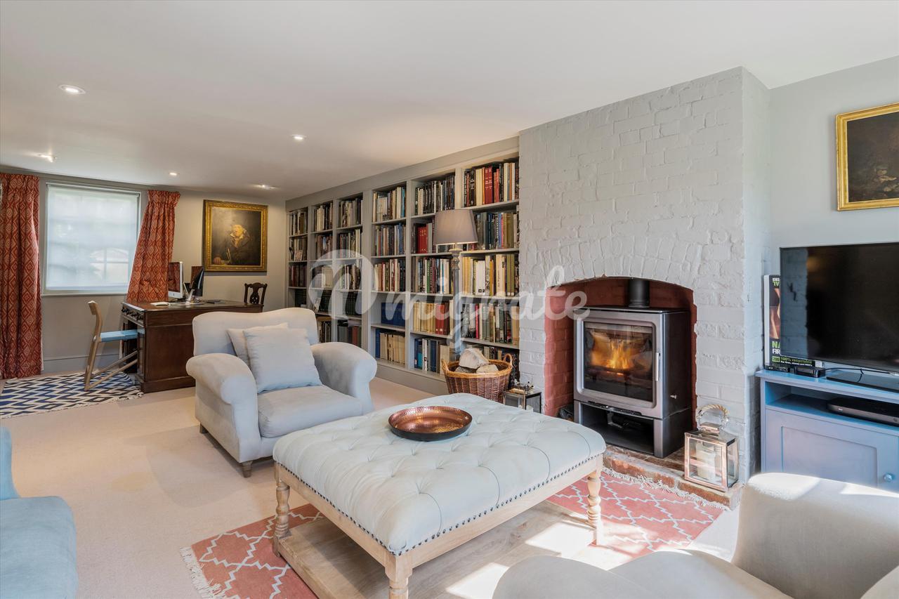 За холлом находится двойная гостиная с дровяной печью и зоной для занятий.