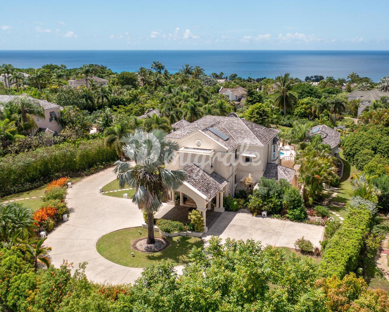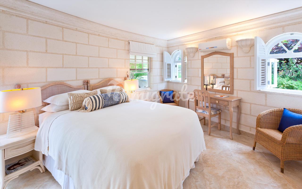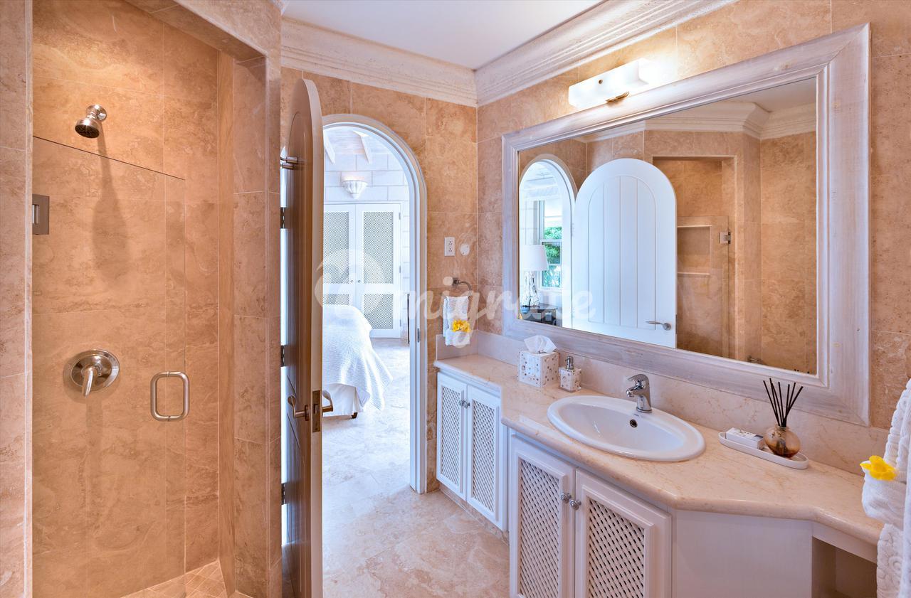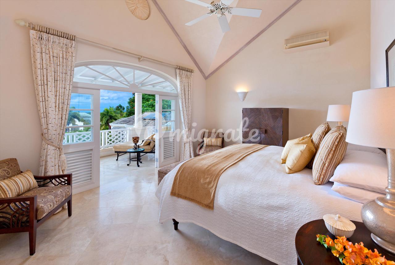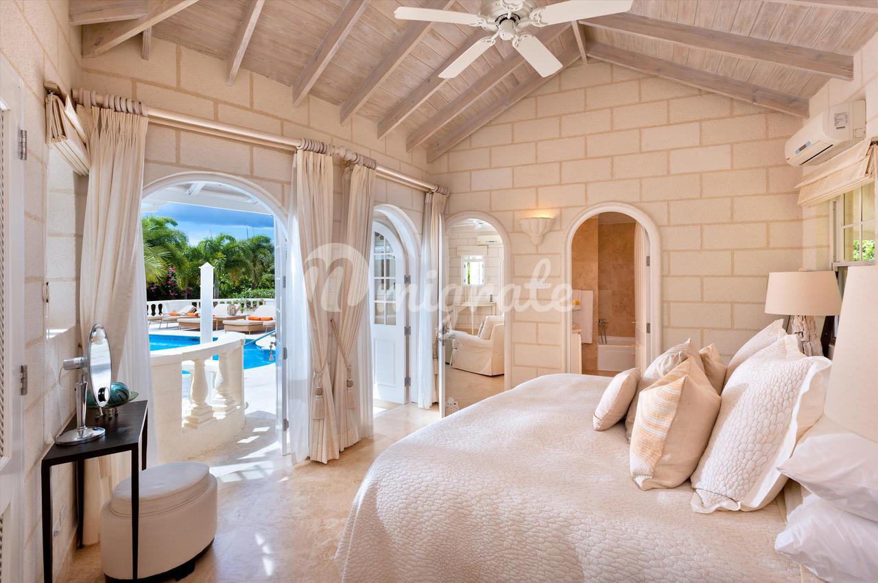 Интерьер главной виллы был со вкусом оформлен в нейтральных тонах, которые сочетаются с отделкой из прохладного кораллового камня, создавая атмосферу простой изысканности с карибским оттенком. На первом этаже порт-кошер ведет вас в гостеприимное фойе, из которого ведет элегантная лестница. Здесь есть хорошо оборудованная кухня, туалетная комната, а также углубленный кабинет и гостиная, выходящие на просторную крытую террасу, которая выходит на террасу у бассейна с обеденной беседкой. Отсюда ступени из кораллового камня с балюстрадой ведут в прекрасно ухоженный тропический сад. На первом этаже расположены три просторных спальных апартамента. Комфортабельный главный люкс и один из гостевых люксов выходят на частную террасу, откуда открывается великолепный вид на бассейн и сады, а также море за его пределами.