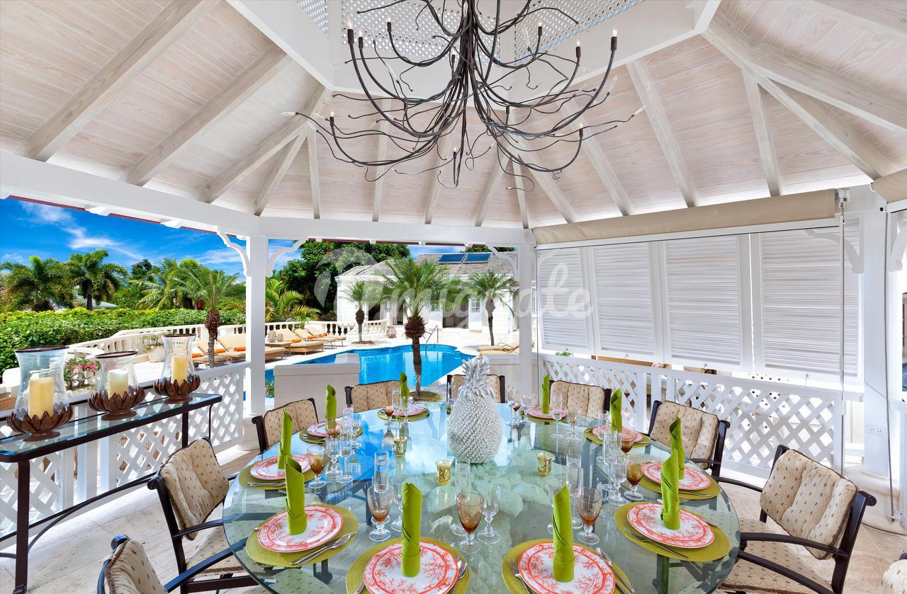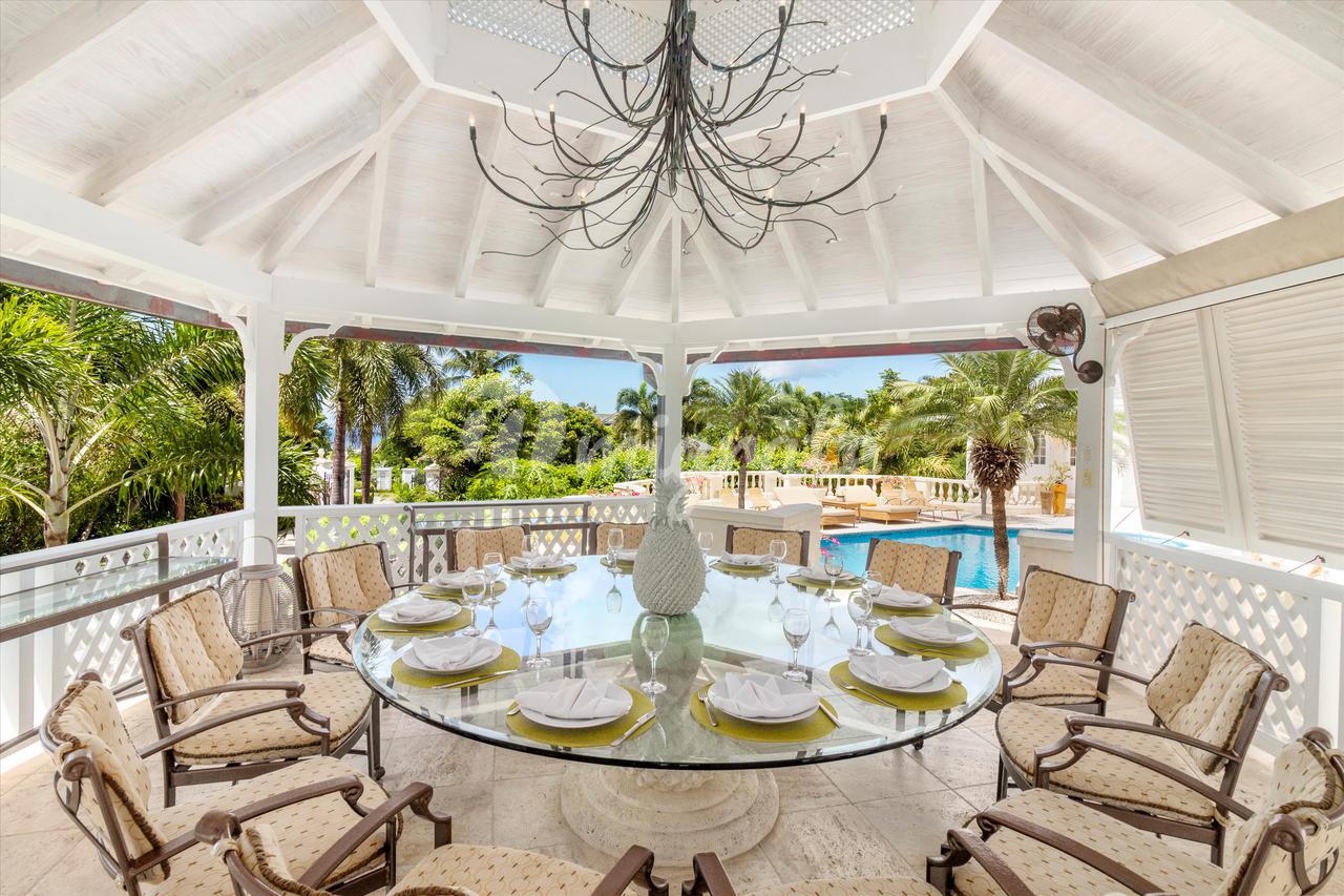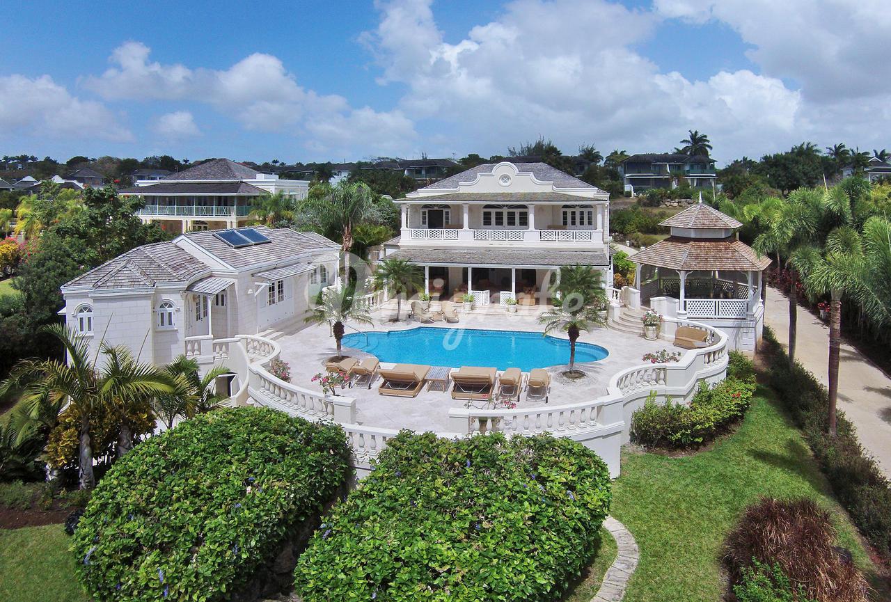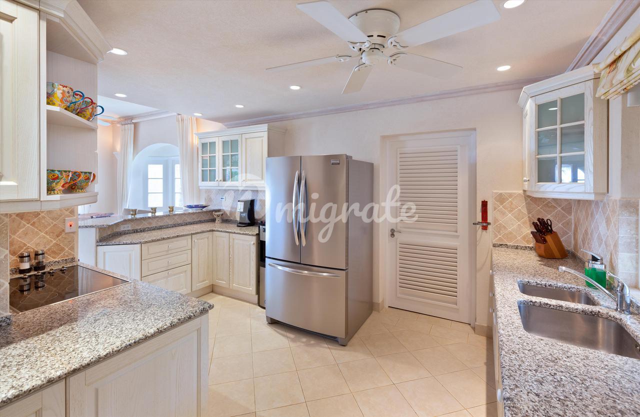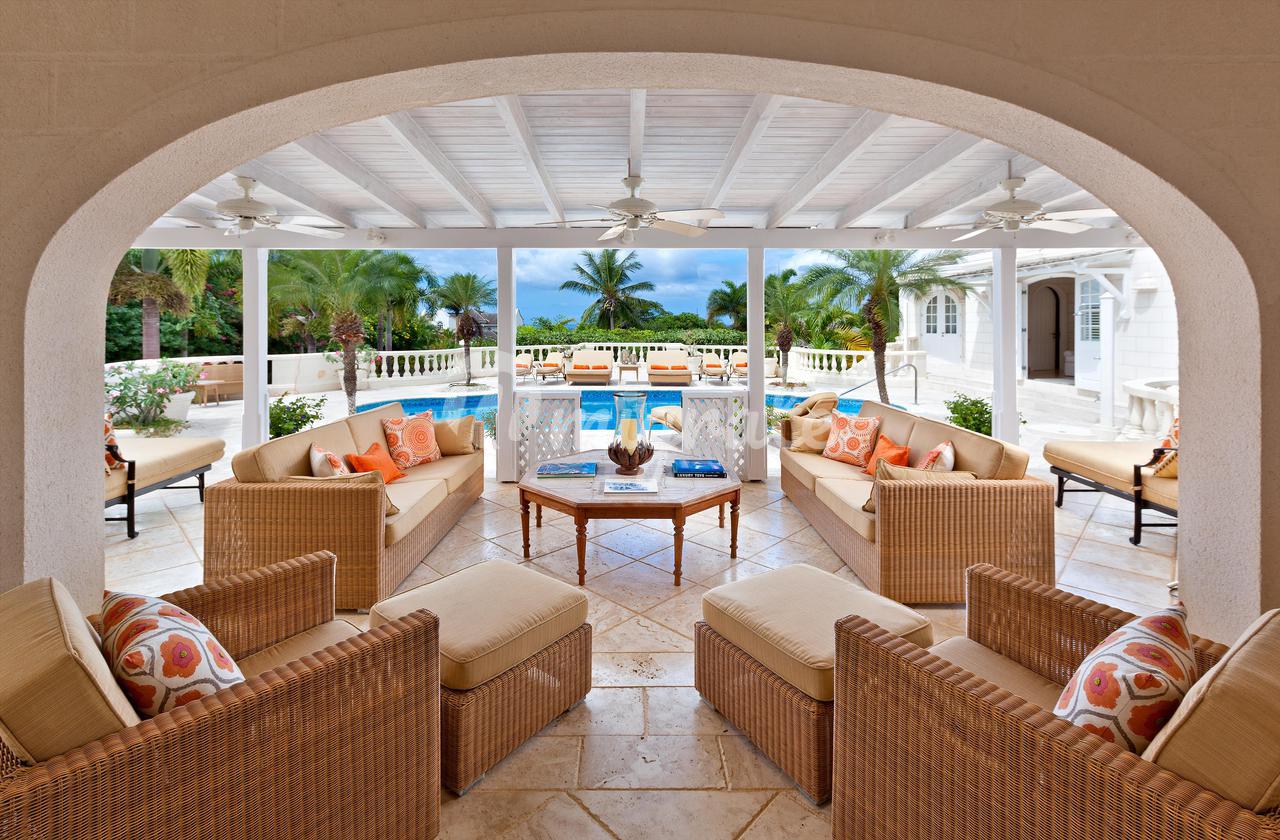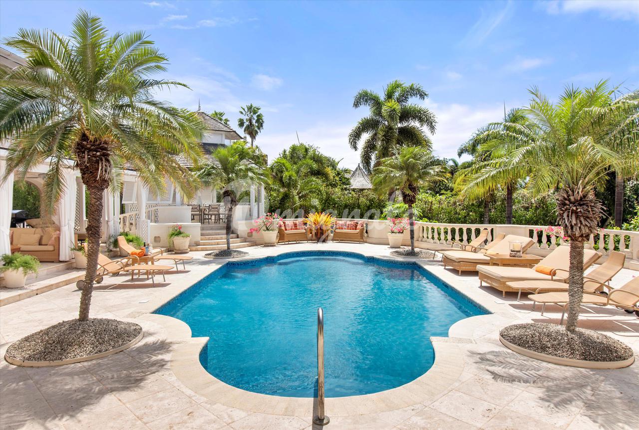 Интерьер главной виллы был со вкусом оформлен в нейтральных тонах, которые сочетаются с отделкой из прохладного кораллового камня, создавая атмосферу простой изысканности с карибским оттенком. На первом этаже порт-кошер ведет вас в гостеприимное фойе, из которого ведет элегантная лестница. Здесь есть хорошо оборудованная кухня, туалетная комната, а также углубленный кабинет и гостиная, выходящие на просторную крытую террасу, которая выходит на террасу у бассейна с обеденной беседкой. Отсюда ступени из кораллового камня с балюстрадой ведут в прекрасно ухоженный тропический сад. На первом этаже расположены три просторных спальных апартамента. Комфортабельный главный люкс и один из гостевых люксов выходят на частную террасу, откуда открывается великолепный вид на бассейн и сады, а также море за его пределами.