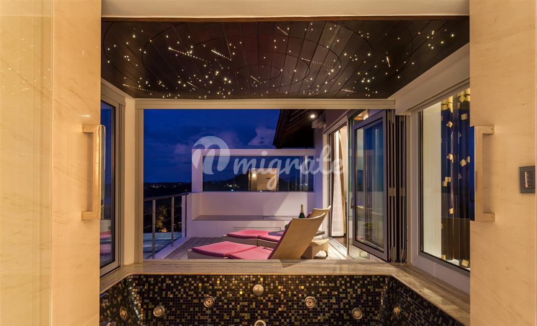 Большая примыкающая к спальне ванная комната оборудована двумя раковинами, большими зеркалами, которые добавляют ощущение простора, туалетным столиком и большой душевой кабиной, которая также служит парилкой. Существует также ванна-джакузи для двоих с окнами на три стороны, так что вы можете расслабиться и насладиться видом днем. Ночью потолок в этой зоне освещается оптоволоконными звездами, которые добавляют атмосферы.