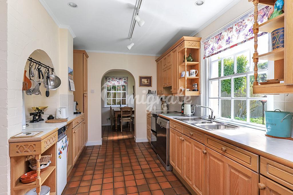 Есть большая гостиная, из которой двойные двери ведут в столовую и зимний сад. Французские двери ведут из этих комнат на террасу и в сад позади дома. Из полностью оборудованной кухни также открывается вид на сад, а в соседнем зале для завтраков есть устойчивая дверь наружу. Существенный первый этаж далее состоит из утренней комнаты, подсобного помещения и гардероба. Наверху главная спальня с двойным аспектом имеет ванную комнату с душем и множество встроенных шкафов. Есть еще три спальни и семейная ванная комната.