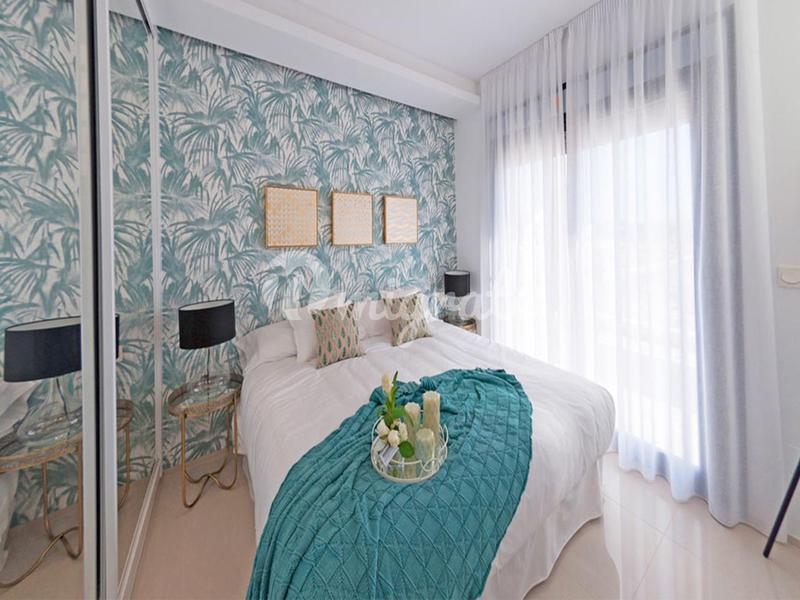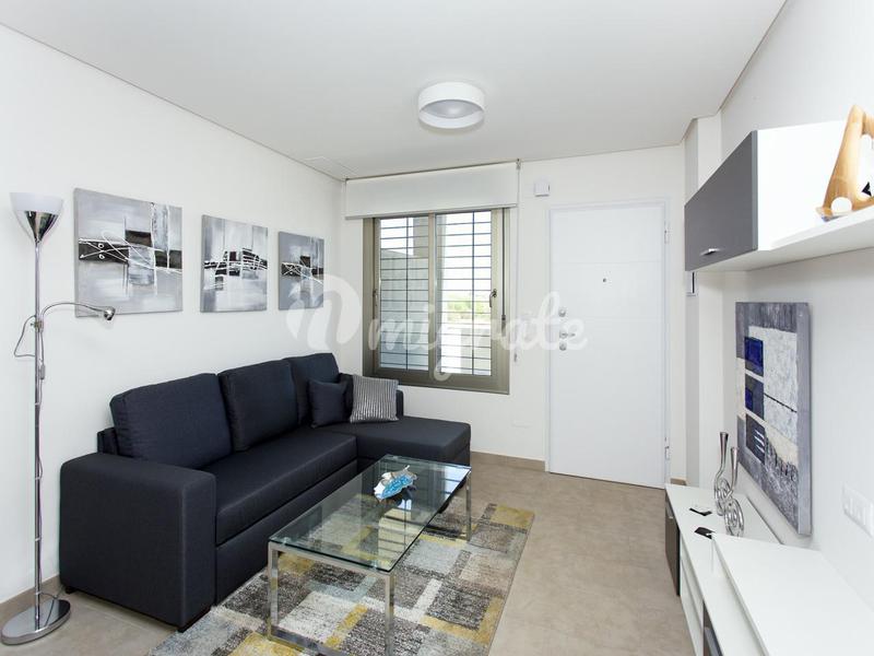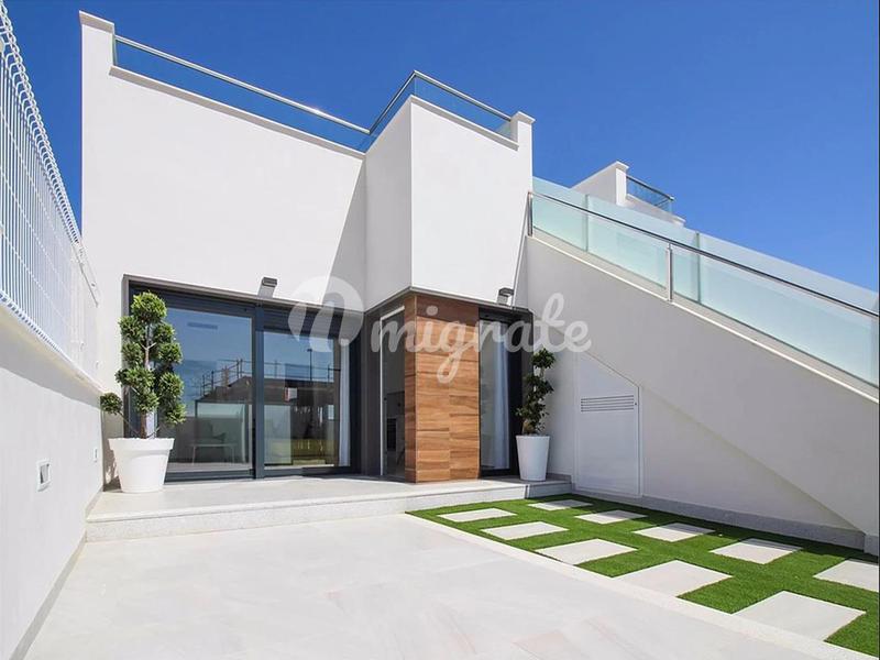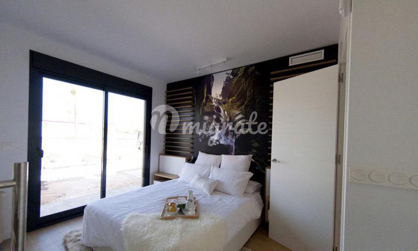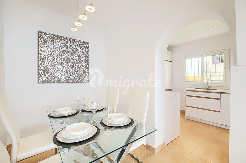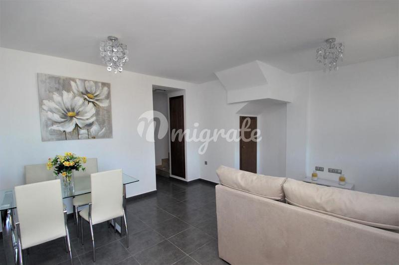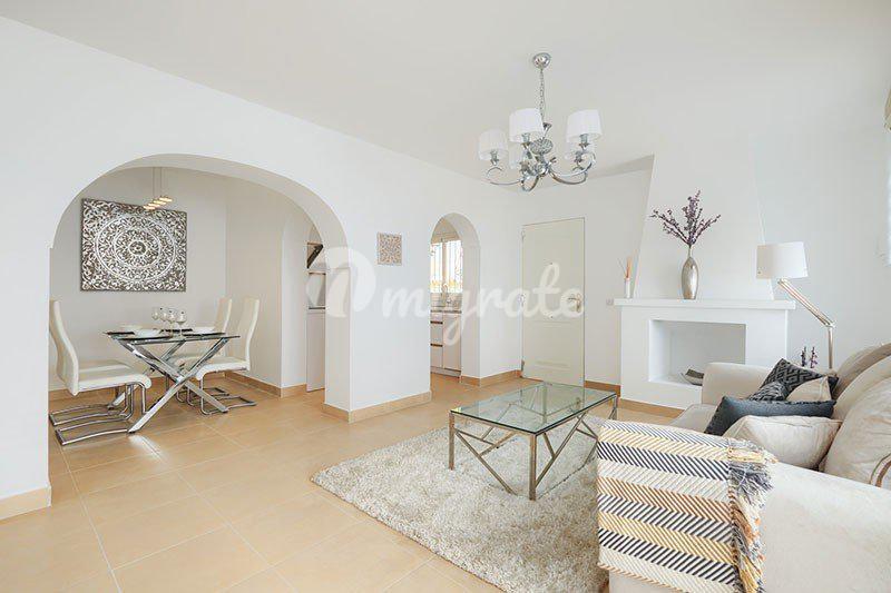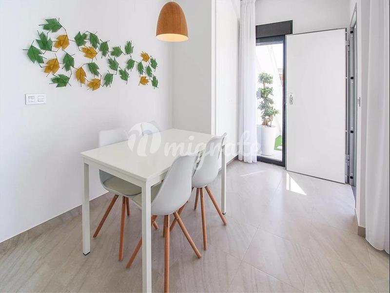 Таунхаус в урбанизации Рода, Сан-Хавьер, Мурсия. Салон, полностью оборудованная открытая кухня, 2 спальни, 2 ванные комнаты, солярий. Общая площадь 70м2. На участке в 120м2 есть сад, джакузи и парково
