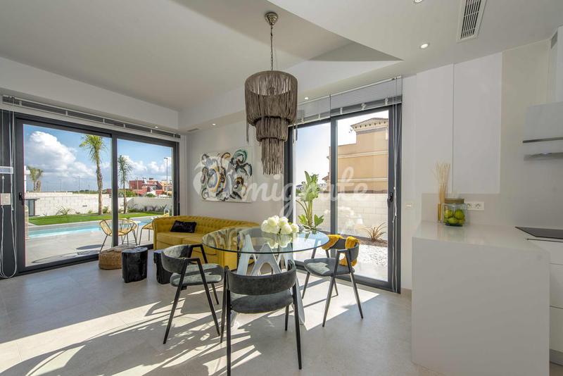 Таунхаус в Вильямартин, Ориуэла-Коста. Большой салон, американская кухня, 3 спальни, 3 ванные комнаты, терраса, солярий, сад 94 м2. Общая площадь 137 м2. В комплексе есть общий бассейн, сад и открытый