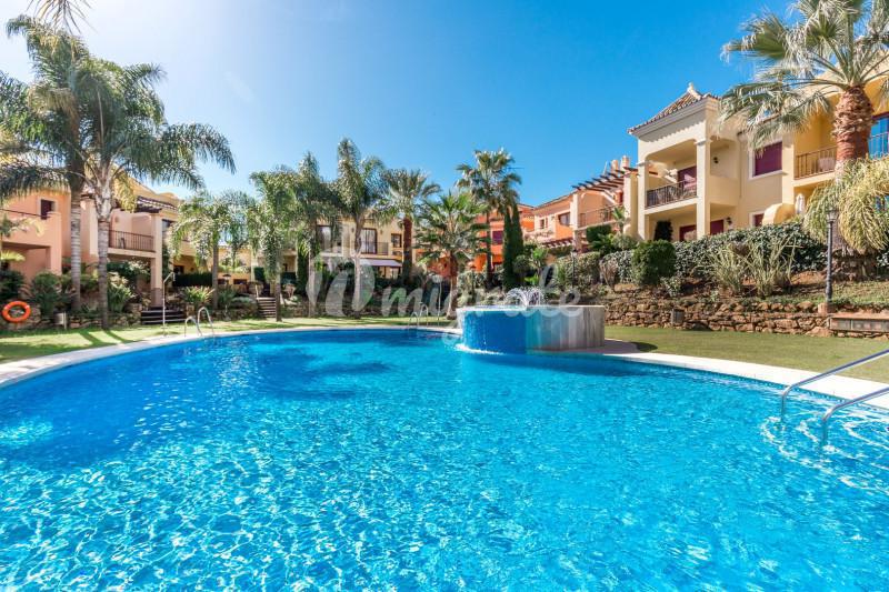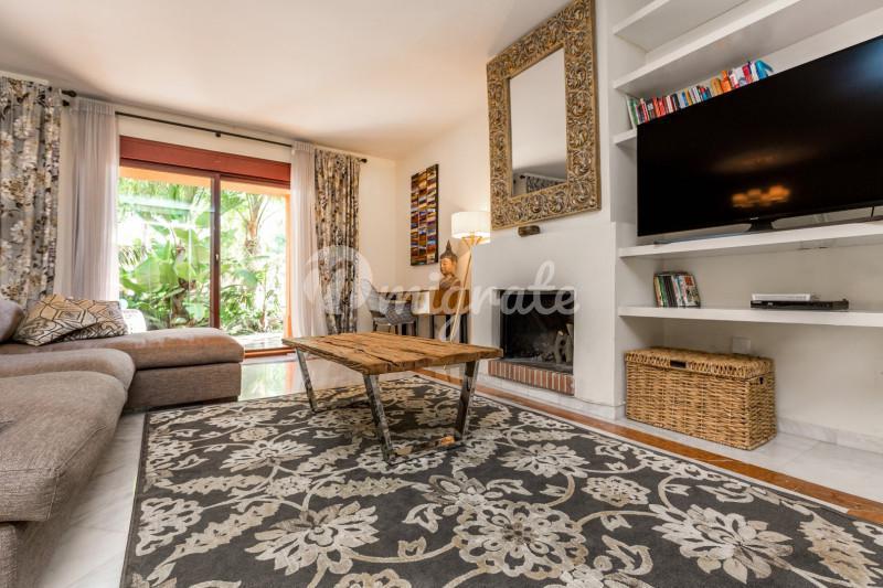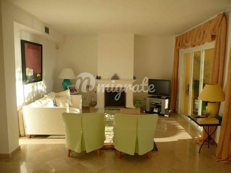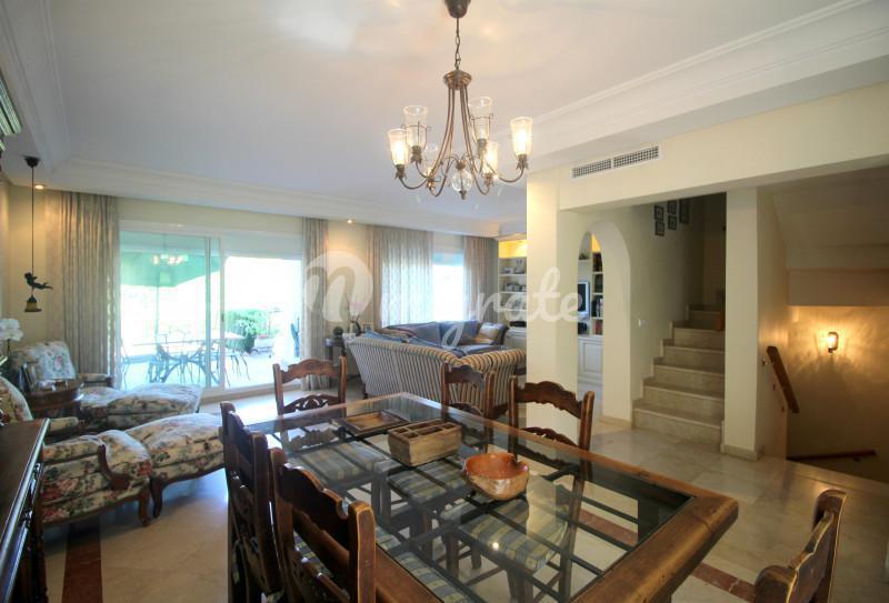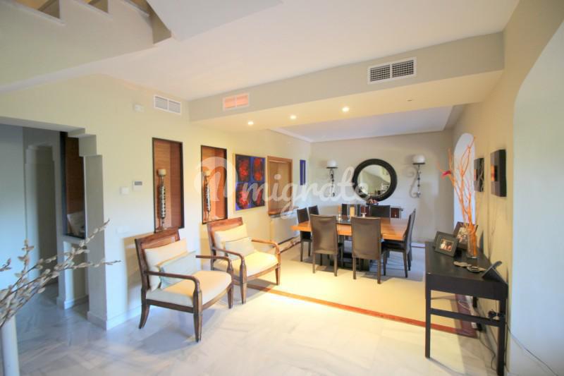 Таунхаус, расположенный в жилом комплексе Marbella Hill Club, в районе Золотая миля, имеет потрясающие виды на горе и море. Просторный холл ведет к гостиной с камином и к полностью оборудованной кухне