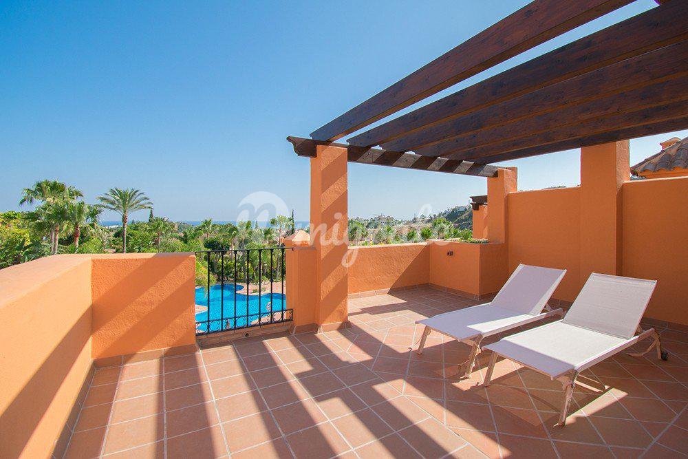 Комплекс El Paraíso Bellevue, состоящий из 14 таунхасов, расположился в районе Бенахавис, между Эстепоной и Марбельей. Все дома двухэтажные с солярием на крыше. На первом этаже расположена просторная гостиная с камином, которая ведет на крытую террасу и в сад. Оборудованная кухня открытой планировки, переходящая в столовую. На втором этаже находятся две спальни и две ванные комнаты, одна из которых находится в главной спальне. Дополнительная терраса/солярий на крыше дает возможность насладиться южным солнцем и видом на море. Все дома имеют два парковочных места рядом с домом (крытых). На территории закрытого охраняемого комплекса есть бассейн и ухоженный сад. Комплекс находится в 1 км от пляжа, в 400м от гольф клуба El Paraiso, всего в 10 мин езды от Марбельи.