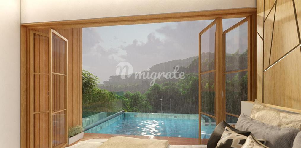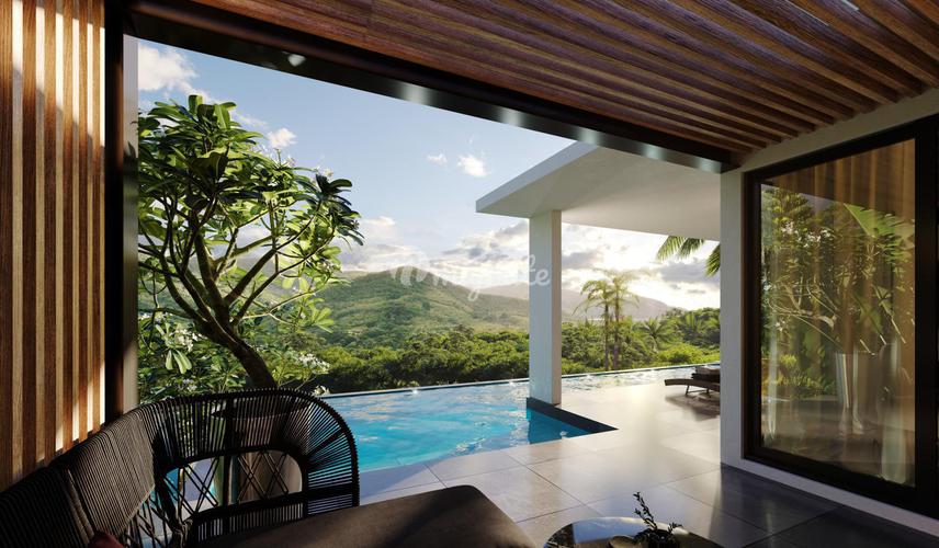 Вилла с бассейном расположена на третьем этаже. С террасы у бассейна открывается захватывающий вид на закат и горы, покрытые пышной тропической зеленью. На вилле есть 3 спальни, каждая из которых обор