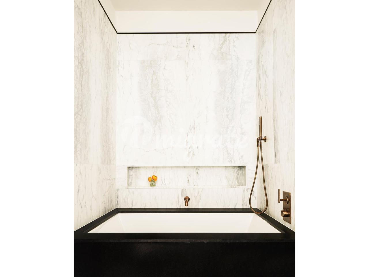 Вторая ванная комната отделана плиткой Bianco Dolomite на стенах, мозаичным полом из абсолютно черного гранита и изготовленным на заказ туалетным столиком из светлого красного дерева. Дополнительные функции резиденции включают стиральную машину и сушилку Miele, а также зонированную систему кондиционирования воздуха для максимального комфорта и гибкости.