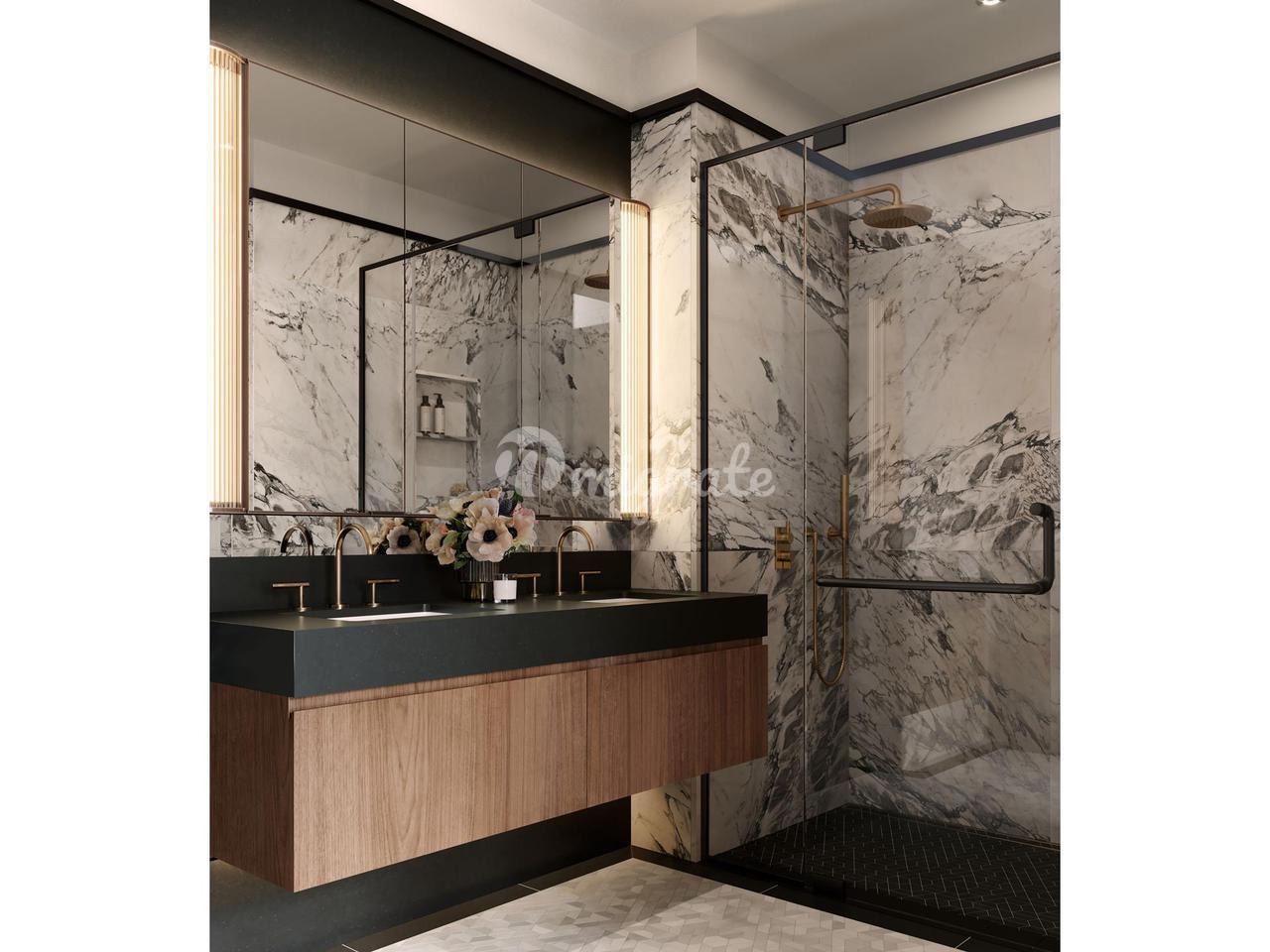 Элегантное фойе с гардеробной и дамской комнатой ведет в захватывающий дух угловой большой зал с северо-восточной и северо-западной экспозициями, высотой потолков до 11 футов и окнами от пола до потолка, из которых открывается потрясающий вид на городской пейзаж, реку и гавань. Богато наслоенные материалы, такие как красное дерево, старинная натертая бронза и полы из белого дуба с нанесенной на заказ медовой краской, создают теплый и интимный интерьер. Центральным элементом большой комнаты является исключительно продуманная открытая кухня, спроектированная студией Gachot Studios, с поразительным графитово-матово-черным корпусом и зеркальными панелями из травленой бронзы, зеркальной задней панелью из полированной бронзы и столешницами из абсолютно черного гранита. Полностью интегрированный набор бытовой техники Miele, включая винный холодильник и сантехнику Waterworks, выполненную на заказ из латуни, дополняет исключительный интерьер.