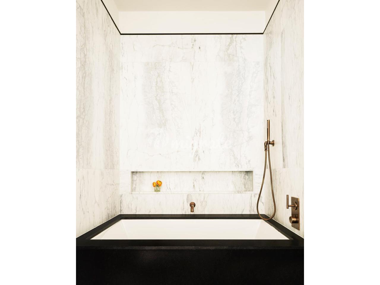 Главная спальня выходит окнами на северо-запад, что является редким местом для наблюдения за закатами и захватывающим видом на город и гавань. Вместительная гардеробная и дополнительный шкаф-купе обеспечивают достаточно места для хранения вещей. В главной ванной комнате в номере есть отдельный душ и ванна для купания, стены отделаны выразительным мрамором Breccia Capria, а полы из абсолютно черного гранита и белого мрамора Bianco Dolomite с шестиугольным рисунком. Изготовленный на заказ туалетный столик из светлого красного дерева с абсолютно черной гранитной столешницей, сантехникой Waterworks, выполненной на заказ из латуни, и встроенными бра из рифленого стекла.