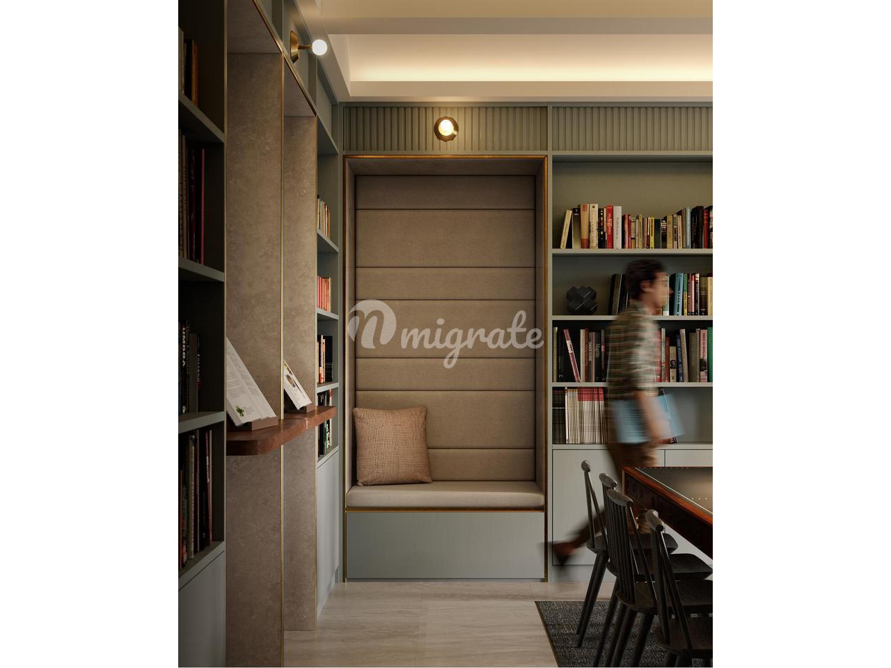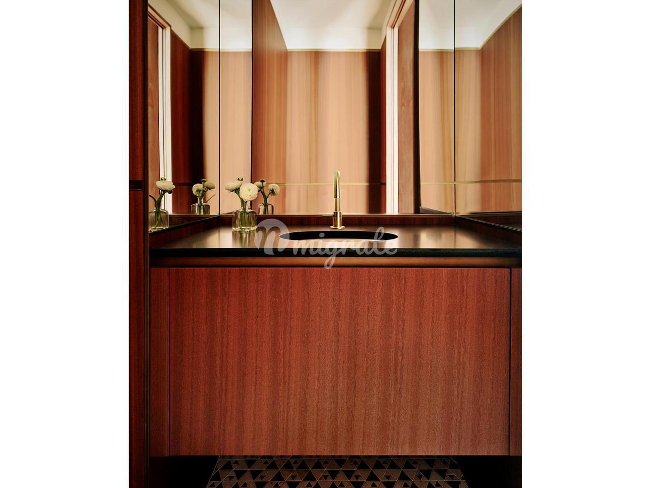 Дополнительные ванные комнаты отделаны плиткой Bianco Dolomite на стенах, мозаичным полом из абсолютно черного гранита и изготовленным на заказ туалетным столиком из светлого красного дерева. Дамская комната отделана светлыми стенами из красного дерева с отделкой из доломита Бьянко и мозаичным полом из абсолютно черного гранита с индивидуальным треугольным рисунком. Дополнительные функции резиденции включают стиральную машину и сушилку Miele, а также зонированную систему кондиционирования воздуха для максимального комфорта и гибкости.