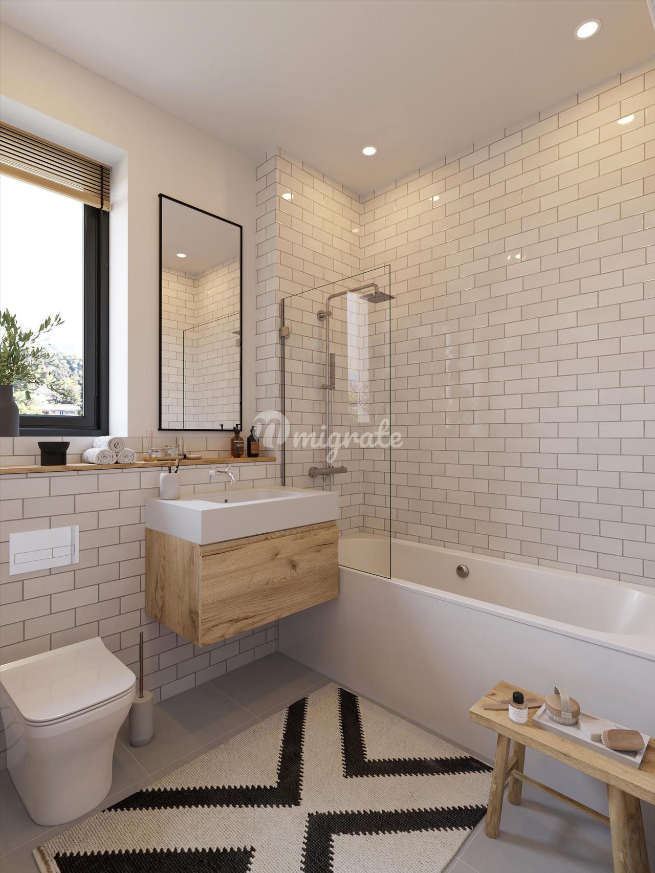 Электрооборудование и освещение • Стандартные светильники для всех комнат с низкоэнергетическими светильниками и хромированными светильниками для кухонных зон и ванных комнат • Выключатели, розетки и другие электрические розетки из белого пластика • Система входа через главную входную дверь, управляемая телефоном • Спутниковая система SKY Q в задней части TV point • Тепловые датчики и дымовая сигнализация, установленные на кухнях • Телефонная розетка, предварительно подключенная к сети в гостиной • Баллонная система горячего водоснабжения под давлением и электрические панельные нагреватели для отопления