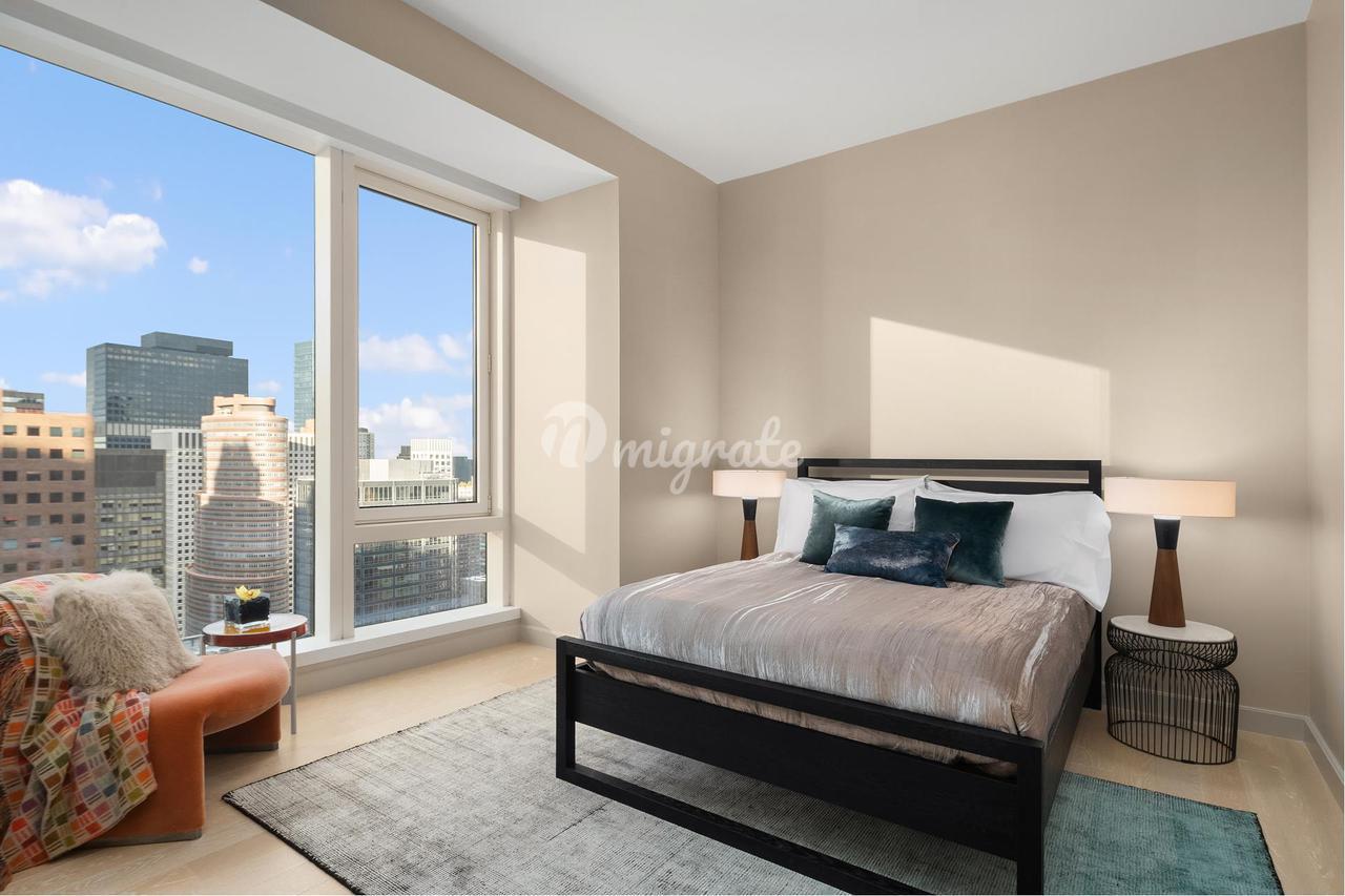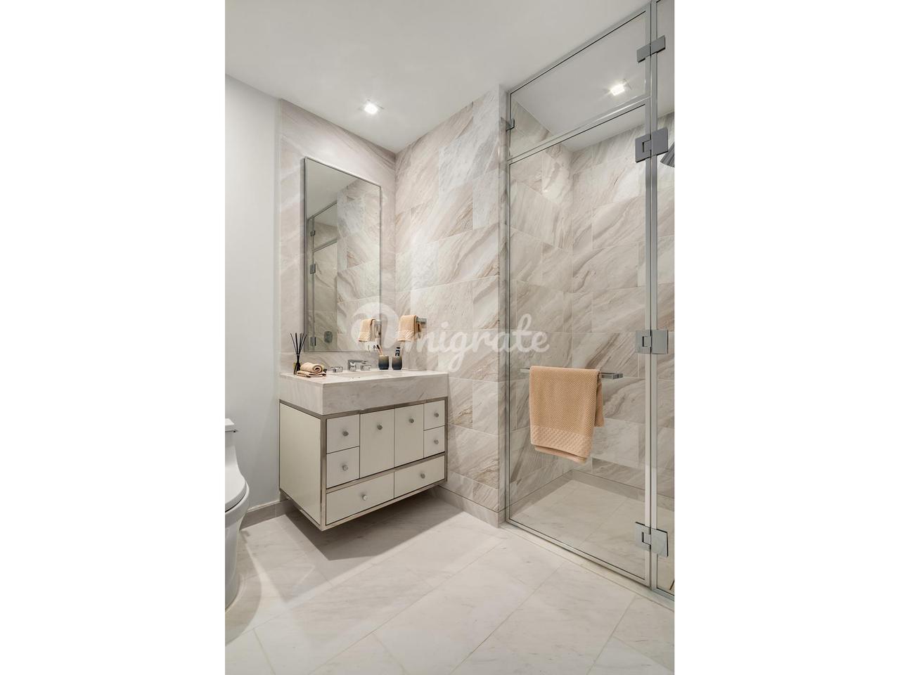 Эта просторная резиденция с двумя спальнями и двумя с половиной ванными комнатами, спроектированная Шампалимо, предлагает вид на север, восток и юг через окна от пола до потолка. Полы из белого дуба повсюду ведут от входа к открытой концепции гостиной и столовой, дополненной кухней шеф-повара с отточенными столешницами из мрамора Капри, задней панелью и островом с водопадом, где есть место для сидения. Кухня отличается изысканной эстетикой благодаря обтекаемой отделке из белого дуба, изготовленной на заказ, которая органично сочетает в себе полный комплект бытовой техники Gaggenau, включая винный холодильник с подсоединением, дополненный сантехникой Dornbracht.