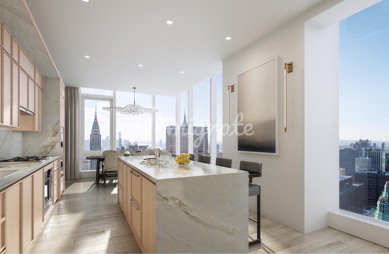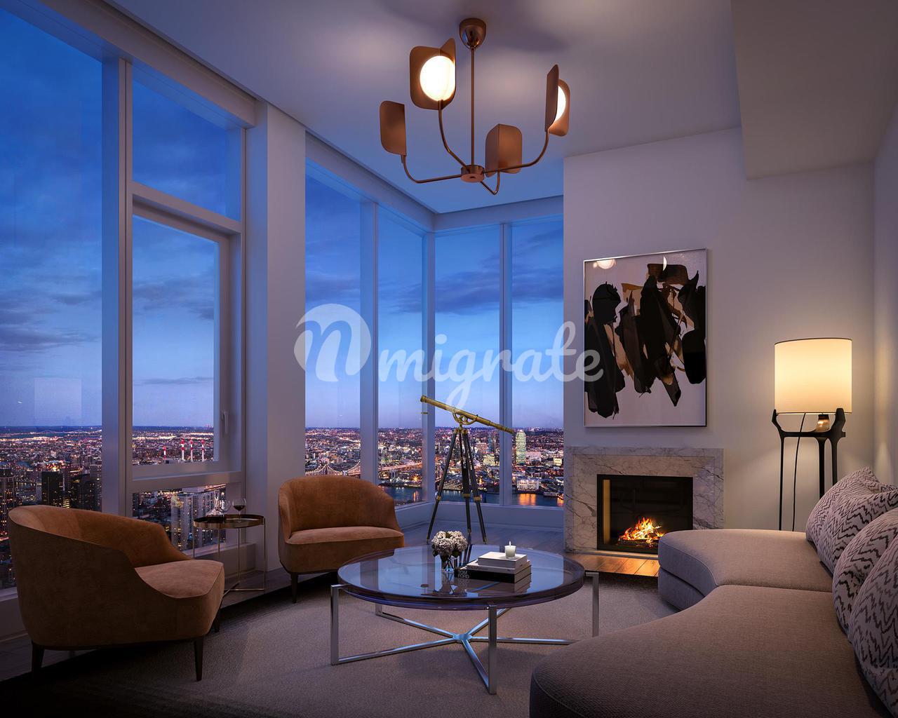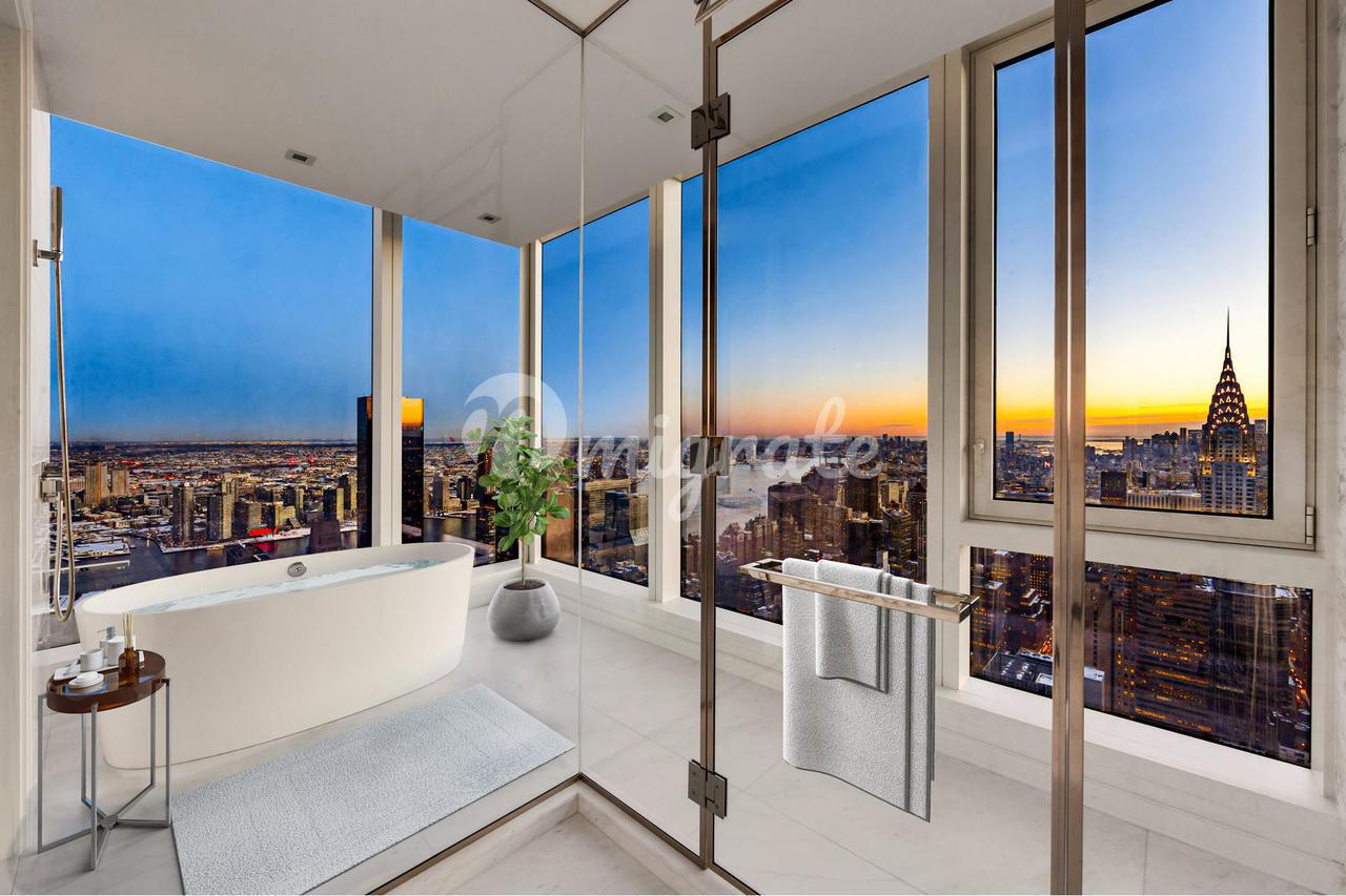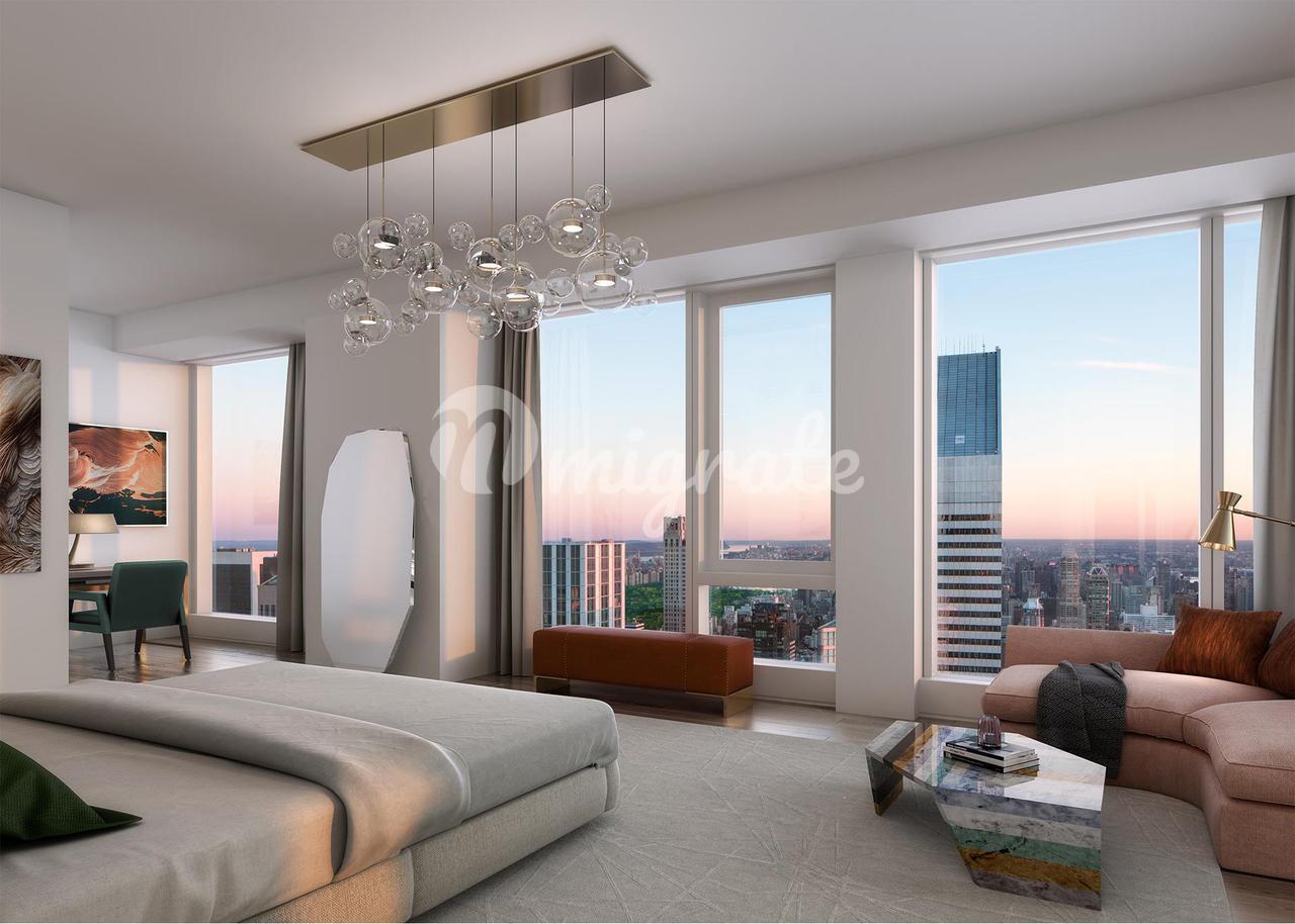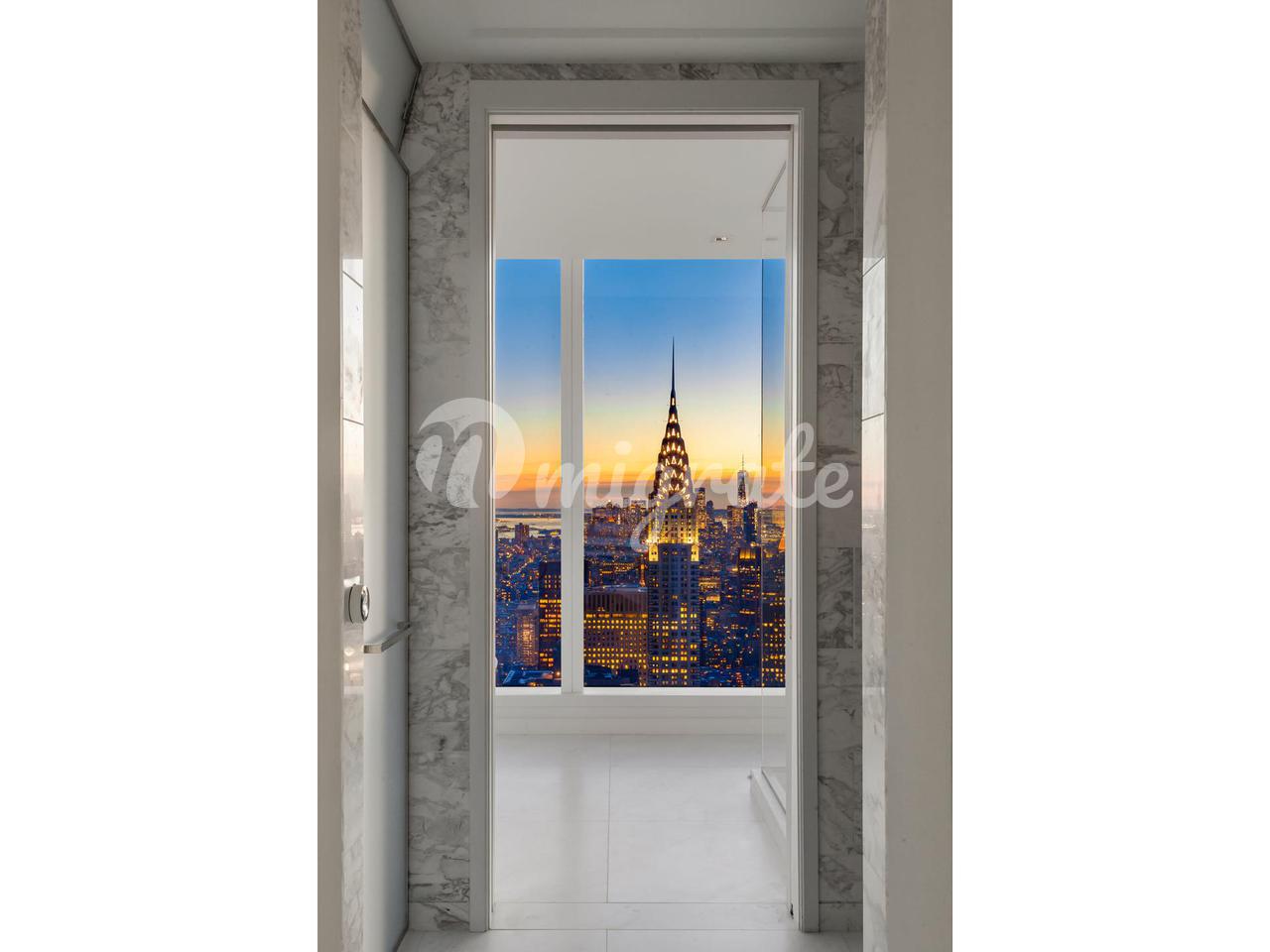 Частный лифт, поднимающийся на 70-й этаж, ведет в фойе дома, которое ведет к красивым и пропорциональным развлекательным помещениям с 12-футовыми потолками и огромными окнами. Основная экспозиция гостиной обращена на север, откуда открывается потрясающий вид на Центральный парк, водохранилище и за его пределами на мост Джорджа Вашингтона, на запад - на знаковые здания, а на восток - на мост 59-й улицы, Ист-Ривер и горизонт Нью-Йорка. С любой точки обзора открывается вид на горизонт Манхэттена и за его пределами.