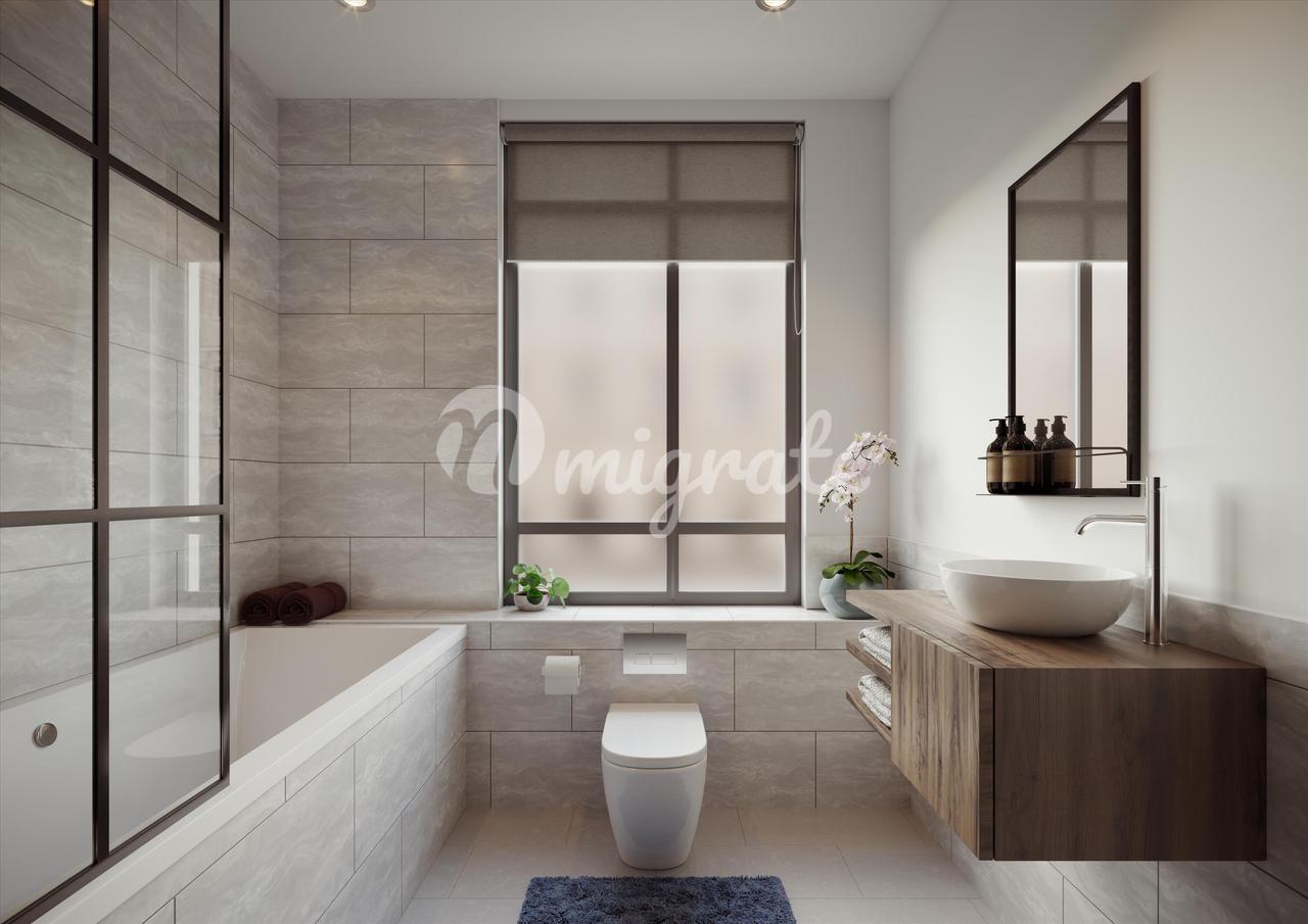 Ванные комнаты и ванная • Тумба под раковину под дуб с белой раковиной и смесителем • Полированный бетон или аналогичная керамическая плитка для стен и пола — от пола до потолка во влажных помещениях. • Унитаз с двойным смывом и плавным закрыванием с хромированным смывом • Насадка для душа с розеткой и хромированным ручным душем • Дизайнерский полотенцесушитель с подогревом