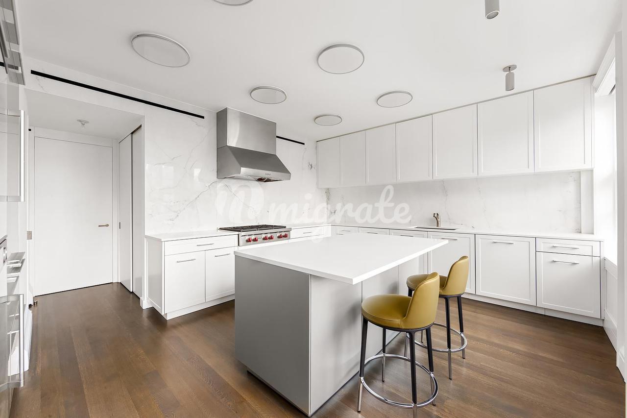 В большой кухне шеф-повара есть три больших окна, выходящих на восток, центральный остров, а также множество шкафов и рабочих мест с трех сторон. Остров достаточно велик как для приготовления пищи, так и для стульев, и в него встроен винный холодильник. Вечная белая деревянная мебель была разработана Bulthaup, а приборы из нержавеющей стали — Wolf, Sub-Zero и Gaggenau.