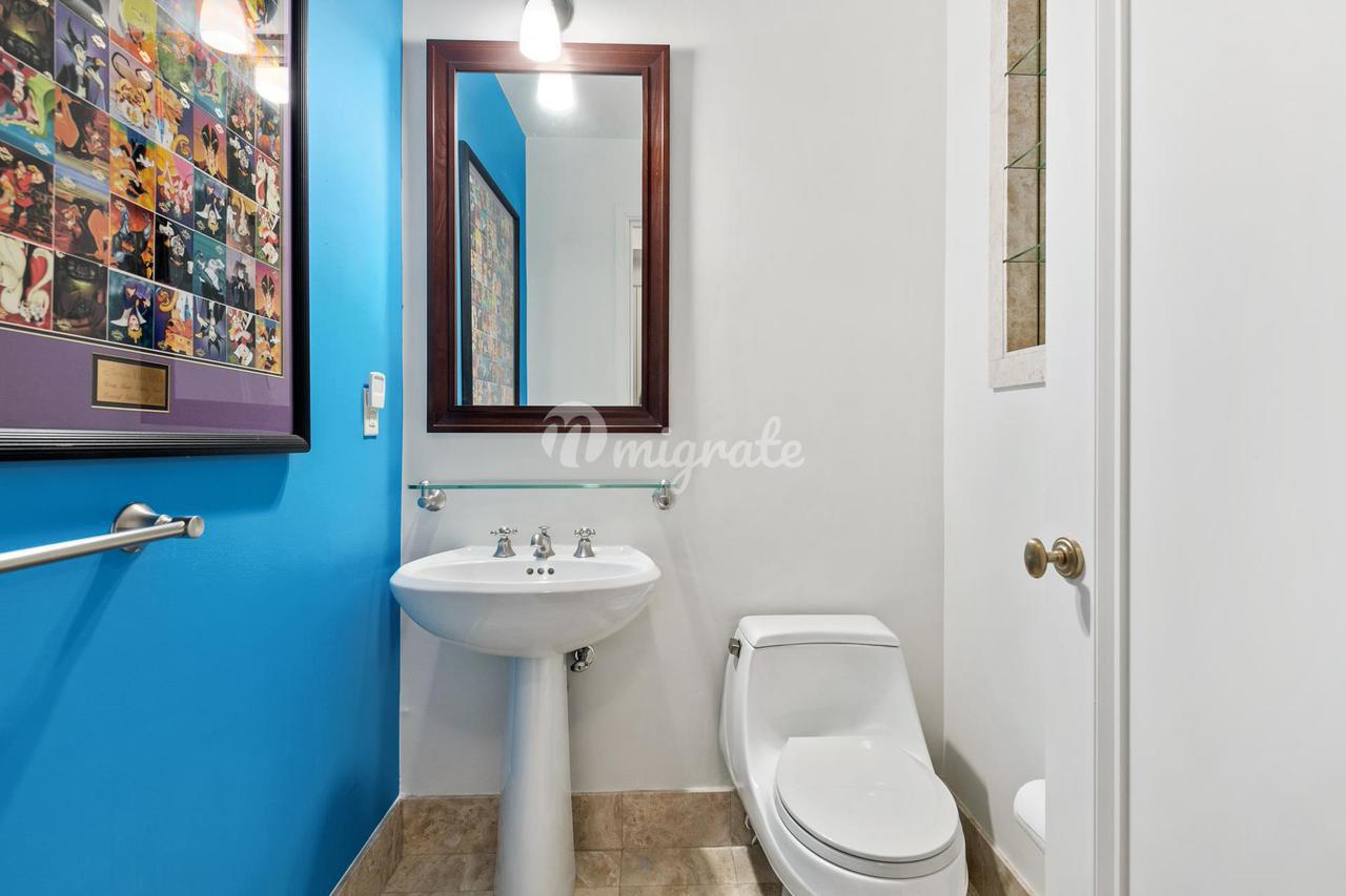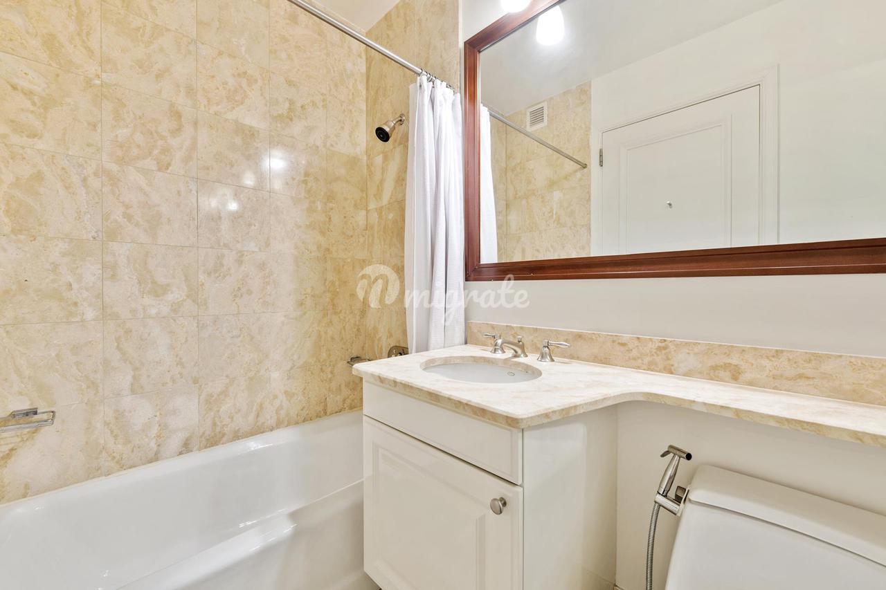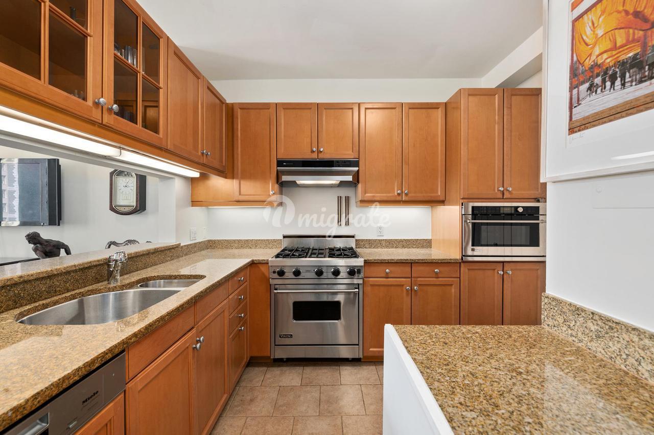 На кухне также установлена вентилируемая стиральная машина и сушилка за откидной дверцей. Спальня имеет большие размеры и идеально подходит для любого сочетания мебели. В ней есть дистанционные автоматические шторы и собственная ванная комната. Ванная комната отделана мраморной плиткой, сантехникой Kohler, ванной для купания, ручным биде и аптечкой для дополнительного места для хранения, а также оснащена дистанционными автоматическими шторками.
