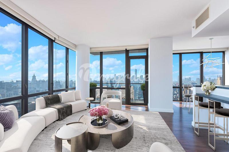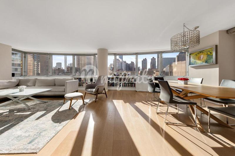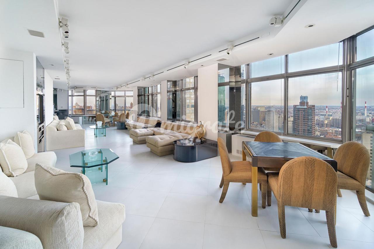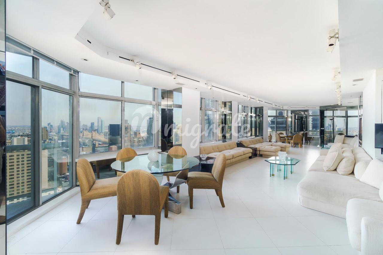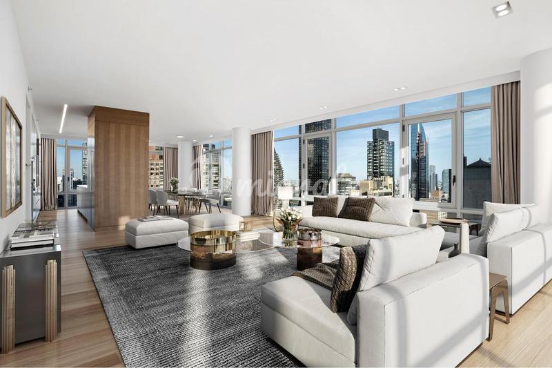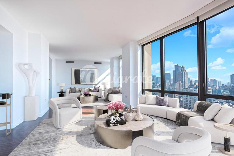 Войдите в впечатляющую почти 50-футовую гостиную с окнами от пола до потолка с широкими открытыми видами на восток, север и юг на город с 39-го этажа.