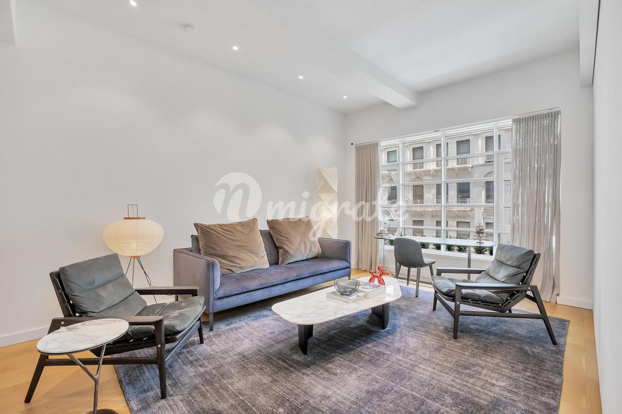Чрезвычайно большая кухня оснащена набором бытовой техники Miele, включая современную индукционную варочную панель и вытяжку, индивидуальный дизайн острова, столешницу и фартук из итальянского белого мрамора, а также винный холодильник. Поистине идеальная кухня для шеф-повара! В главной спальне есть гардеробная, ведущая в спа-салон с пятью светильниками, похожий на ванную комнату, облицованную отшлифованным известняком. Дополнительные функции включают стиральную машину / сушилку, потолки высотой до 11 футов в жилых помещениях, 5-дюймовые полы из белого дуба и большие створчатые окна. Высокая высота потолка и стена окон действительно добавляют квартире уникальное измерение.