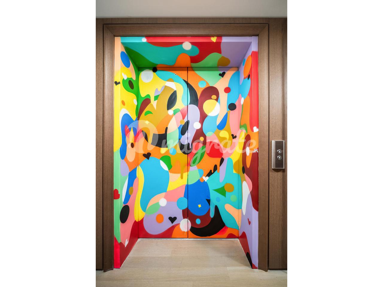 PH изготовлен по индивидуальному заказу с отделкой, включая очень хорошо выполненные стены из венецианской штукатурки повсюду, изготовленные на заказ столярные изделия из тонированного дуба с расщелинами, полы из твердой древесины из белого дуба в елочку и многое другое. Полы с подогревом везде. Фойе главного входа отделано импортным бельгийским черным мрамором, экзотическим янтарным ониксом и калькатта-прима, а пол из отшлифованного известняка Supai.