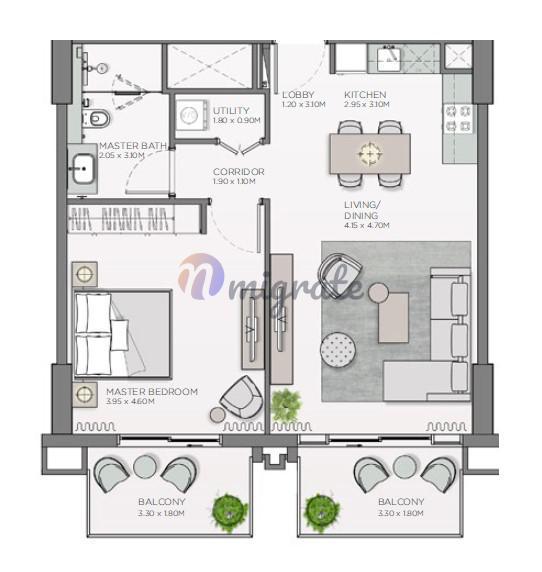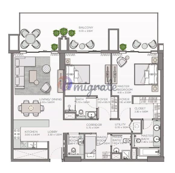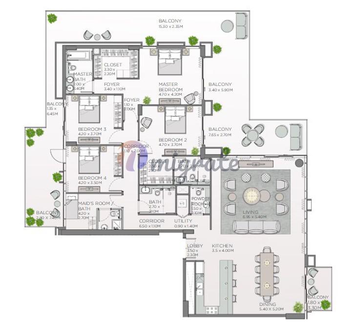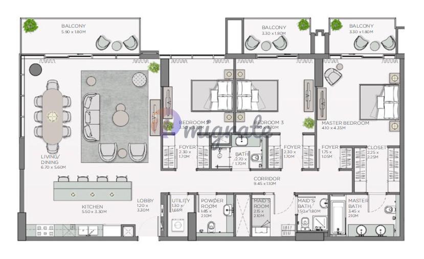В каждой резиденции в Thyme будут от одного до нескольких балконов, подсобное помещение и лобби, в некоторых — кладовая. В апартаментах с 3-4 спальнями так же предусмотрена комната для прислуги. Из окон резиденций будет открываться вид на зеленый парк.