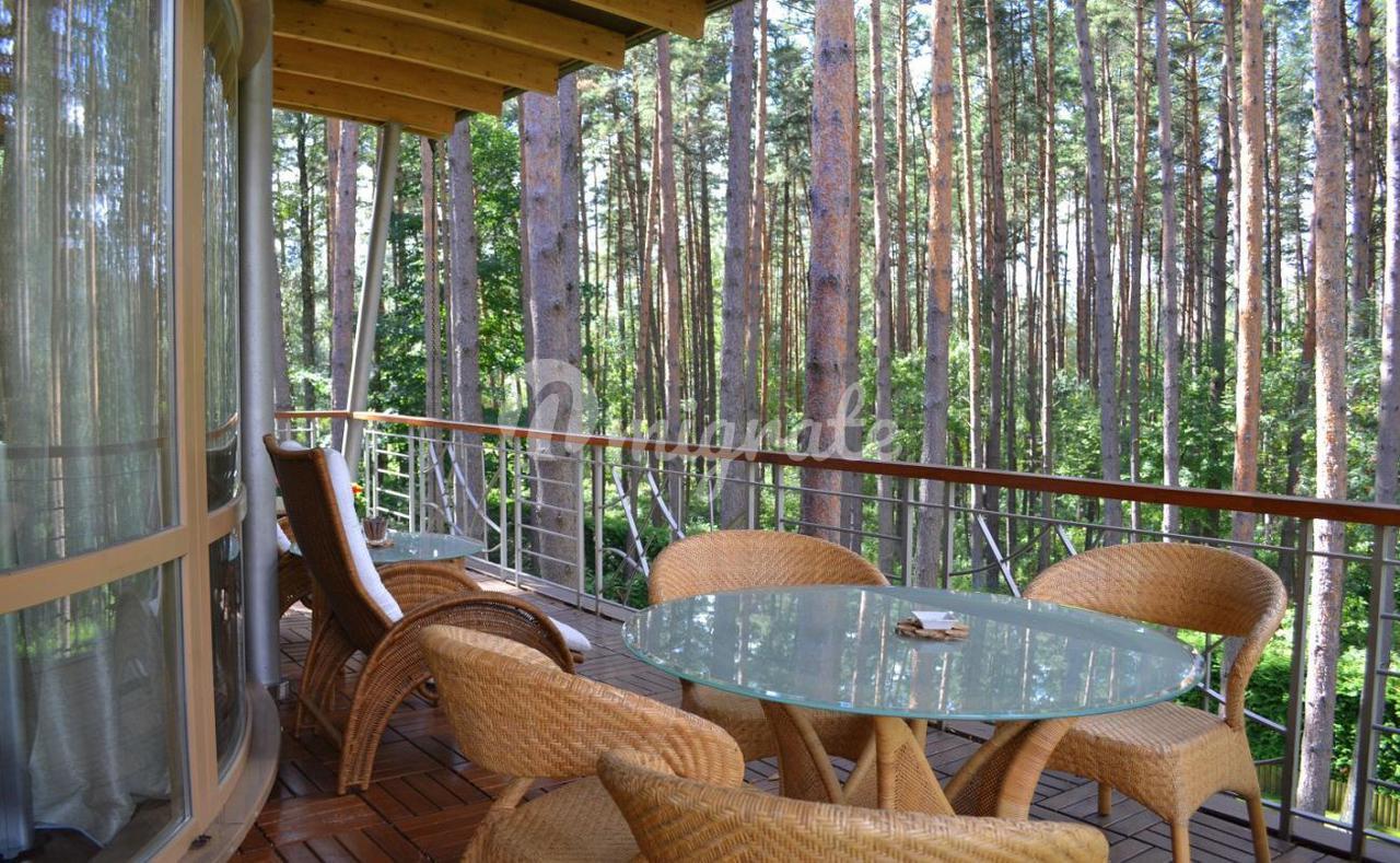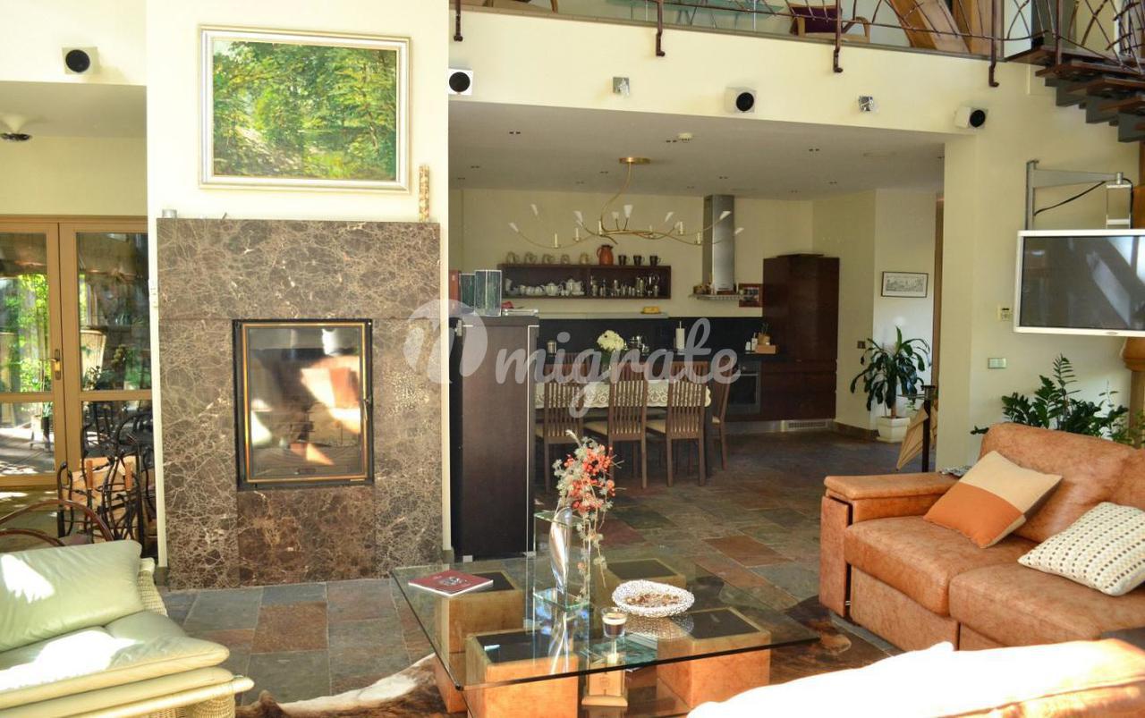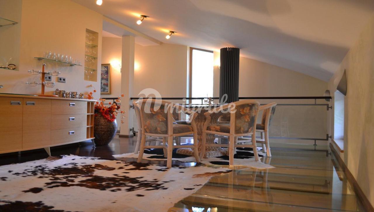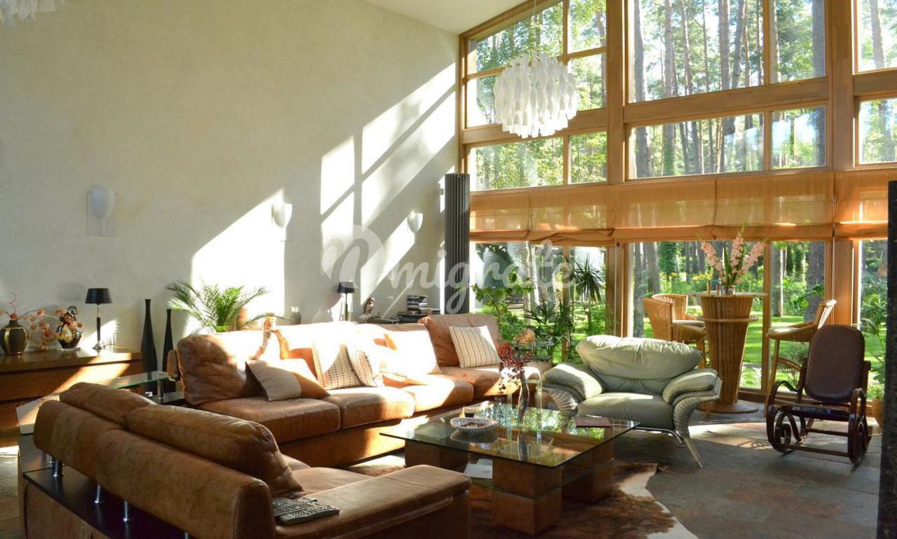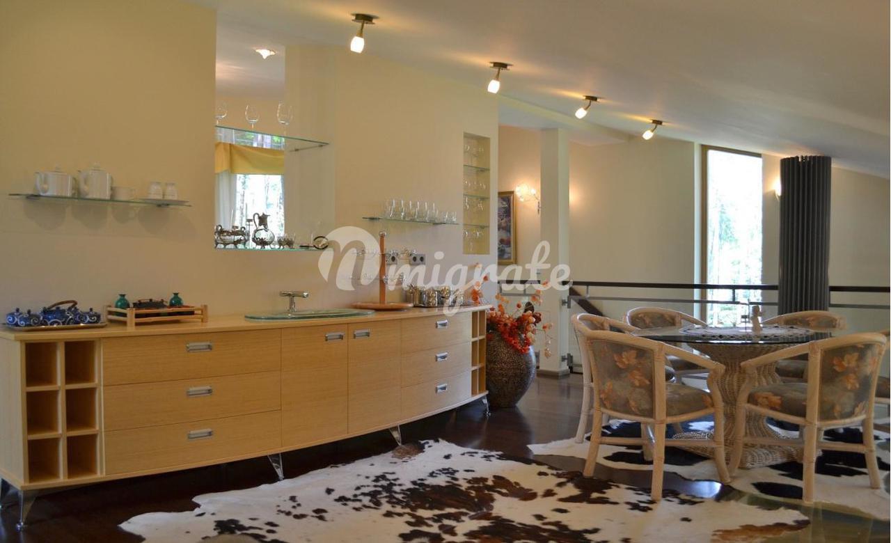 На первом этаже расположена широкая гостиная с камином и панорамными окнами. В отделке гостиной использовались декоративная штукатурка, натуральный камень на полу с подогревом, установлены отопительные радиаторы в виде колон. К гостиной примыкает столовая и кухня со всей необходимой техникой Bosch, имеется выход на благоустроенную террасу и в парк. На первом этаже также расположена отдельная спальня со своим санузлом, а также гостевой санузел. На втором этаже 2 спальни с панорамными окнами в парк и террасами, каждая со своим санузлом. На третьем этаже комната отдыха с оборудованной кухней, большими эркерного типа окнами, стеклянным полом и террасой. В парке имеется свой пруд с живой форелью, беседка для отдыха, зона отдыха с русской печью. В доме имеются все городские коммуникации, отопление газовое, имеются самоочищающиеся фильтры для воды. Также здесь расположено специальное помещение для охраны - отдельная квартира с входом, в которой имеется гостиная студийного типа, совмещенная с кухней в полной комплектации, санузел и спальня. Есть навес для 2 машин. Дом сдан в эксплуатацию.