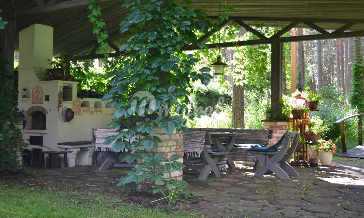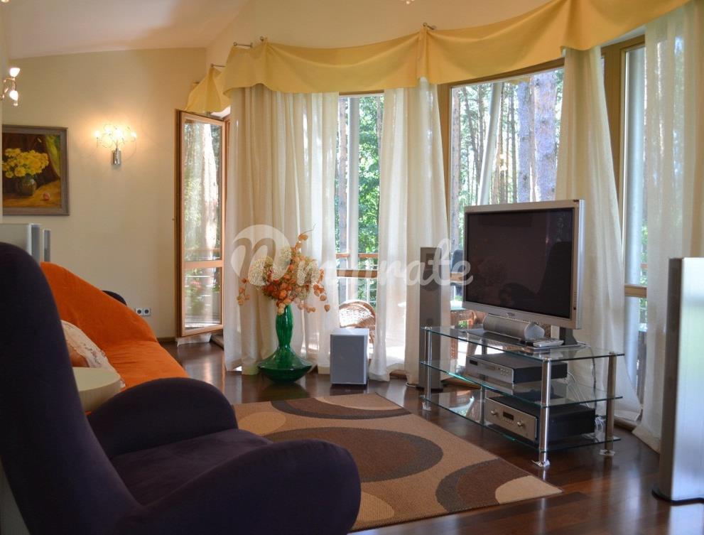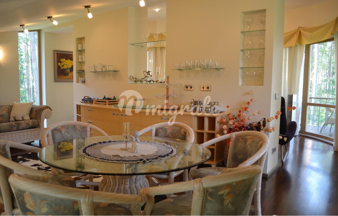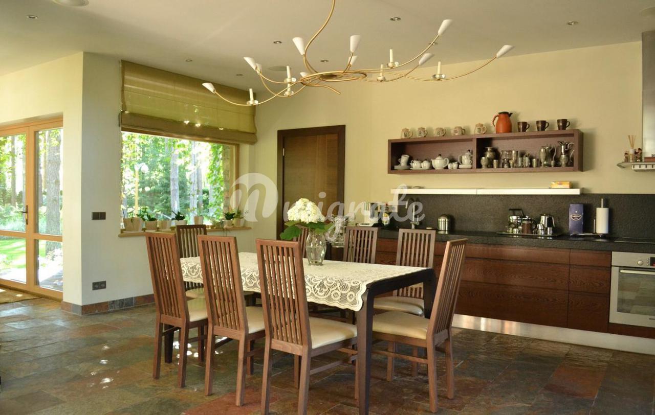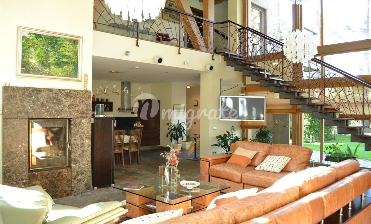 На первом этаже расположена широкая гостиная с камином и панорамными окнами. В отделке гостиной использовались декоративная штукатурка, натуральный камень на полу с подогревом, установлены отопительные радиаторы в виде колон. К гостиной примыкает столовая и кухня со всей необходимой техникой Bosch, имеется выход на благоустроенную террасу и в парк. На первом этаже также расположена отдельная спальня со своим санузлом, а также гостевой санузел. На втором этаже 2 спальни с панорамными окнами в парк и террасами, каждая со своим санузлом. На третьем этаже комната отдыха с оборудованной кухней, большими эркерного типа окнами, стеклянным полом и террасой. В парке имеется свой пруд с живой форелью, беседка для отдыха, зона отдыха с русской печью. В доме имеются все городские коммуникации, отопление газовое, имеются самоочищающиеся фильтры для воды. Также здесь расположено специальное помещение для охраны - отдельная квартира с входом, в которой имеется гостиная студийного типа, совмещенная с кухней в полной комплектации, санузел и спальня. Есть навес для 2 машин. Дом сдан в эксплуатацию.