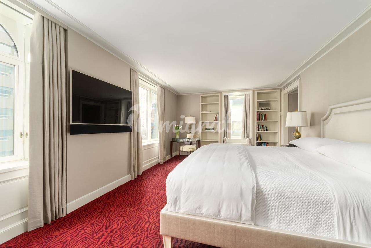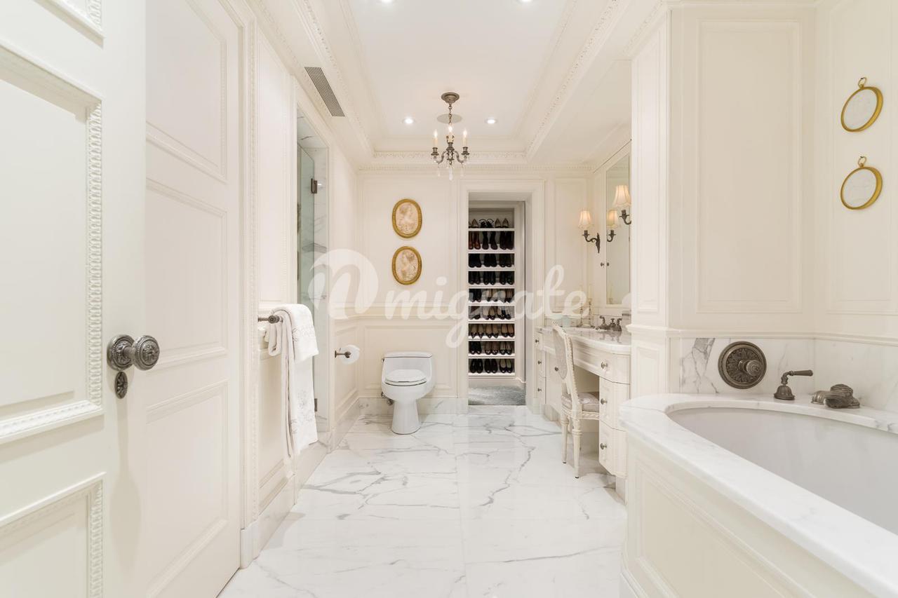 Главная спальня просторная, с прилегающей гостиной, барной стойкой с холодильником и двойными мраморными ванными комнатами. В первой ванной комнате есть душевая кабина, полы с подогревом, водопроводная арматура и гардеробная с большим количеством мест для хранения вещей. Вторая ванная комната облицована потрясающим белым скульптурным мрамором и оснащена большой ванной, отдельной мраморной душевой кабиной, туалетным столиком, бельевым шкафом, просторной гардеробной и гардеробной.