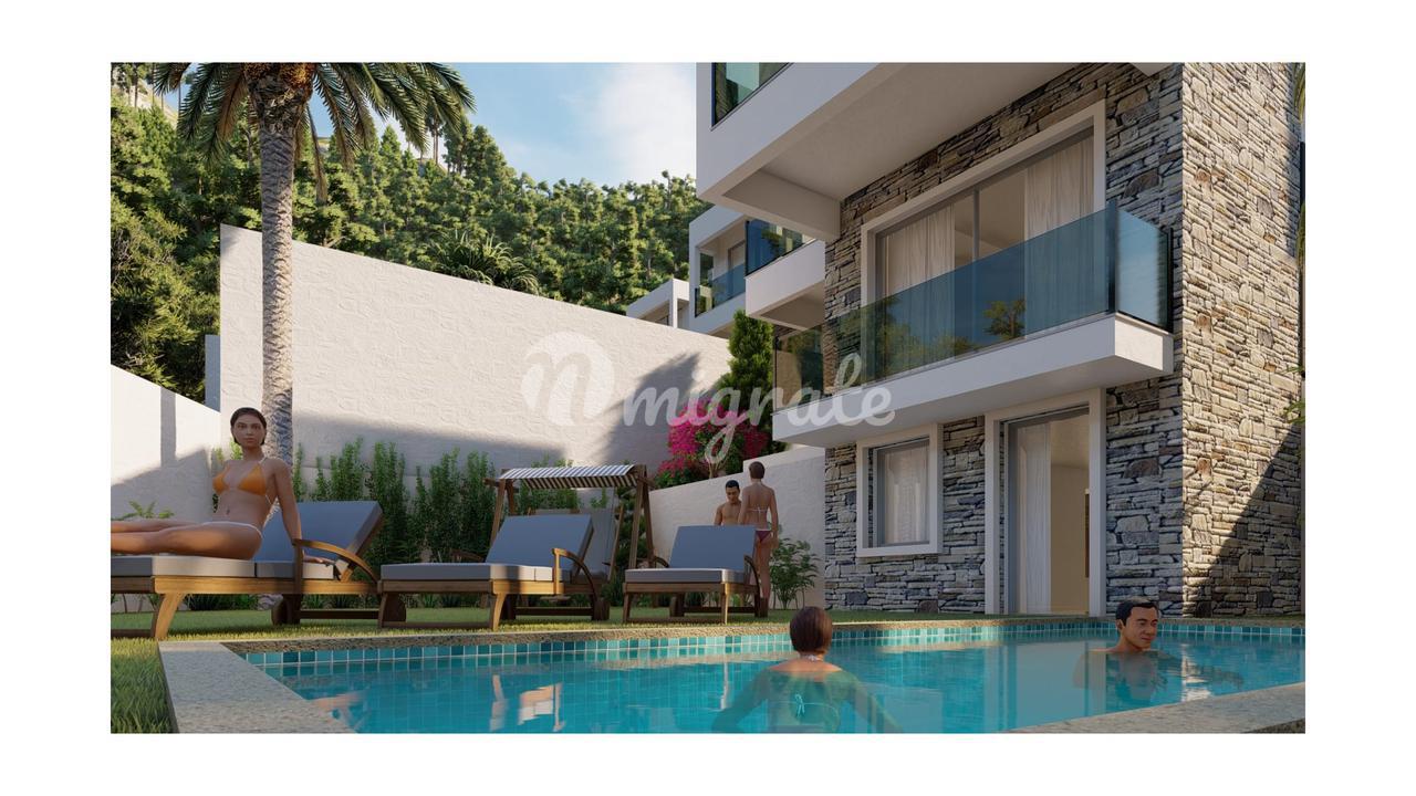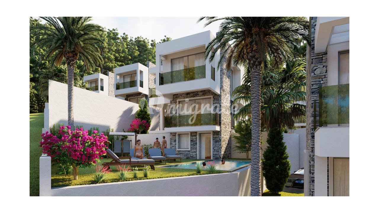 Отдельные трехэтажные виллы в бутик-комплексе: 4 спальни, 4 ванные комнаты, 2 гостиные, 1 кухня. Каждая вилла построена на участке площадью 300 м2. На территории имеются частный сад, бассейн. Всего 10 вилл в комплексе. Инфраструктура: 20 км до центра Бодрума, 18 км до аэропорта Бодрума, 1,5 км до торгового центра, 5 км до ближайшего пляжа. Каждая вилла состоит из дуплекса 3+1 и части 1+1, т. е. трансформируется в полноценный дом или может быть использован в двух отдельных частях.