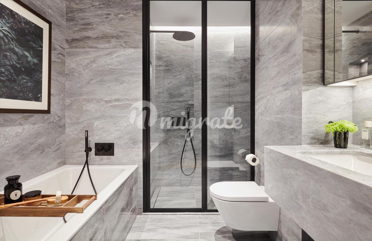 Обтекаемая кухня оснащена встроенной бытовой техникой Miele или аналогичной, каменными столешницами и фурнитурой из нержавеющей стали. В спальне есть гардеробная, ведущая в ванную комнату, отделанную серым мрамором с белыми прожилками, украшенную элегантными черными светильниками и фурнитурой MCS, Duravit, Bette или аналогичными. TwentyFive — это эксклюзивная коллекция квартир-студий, квартир с 1, 2, 3 и 4 спальнями и пентхаусов, разработанная Native Land и расположенная в оживленном районе Мэрилебон W1.