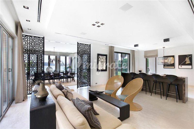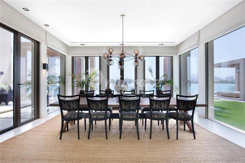 Современная 7-спальная вилла расположена на краю "ветви" I острова Пальма Джумейра. Из окон открываются потрясающие виды на марину Дубая, и отель Atlantis. На первом этаже находится просторная гостина
