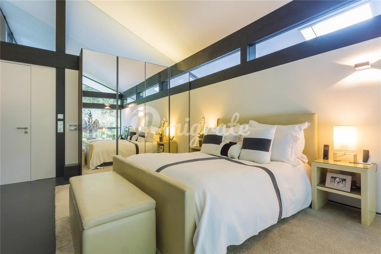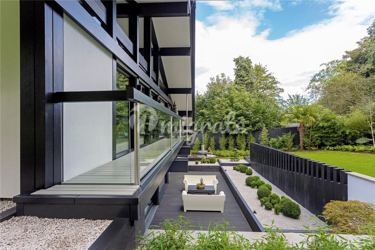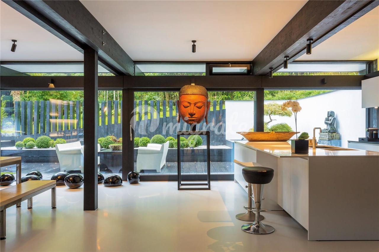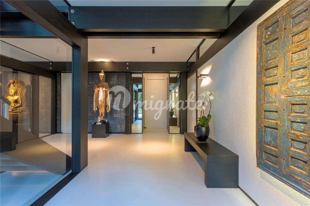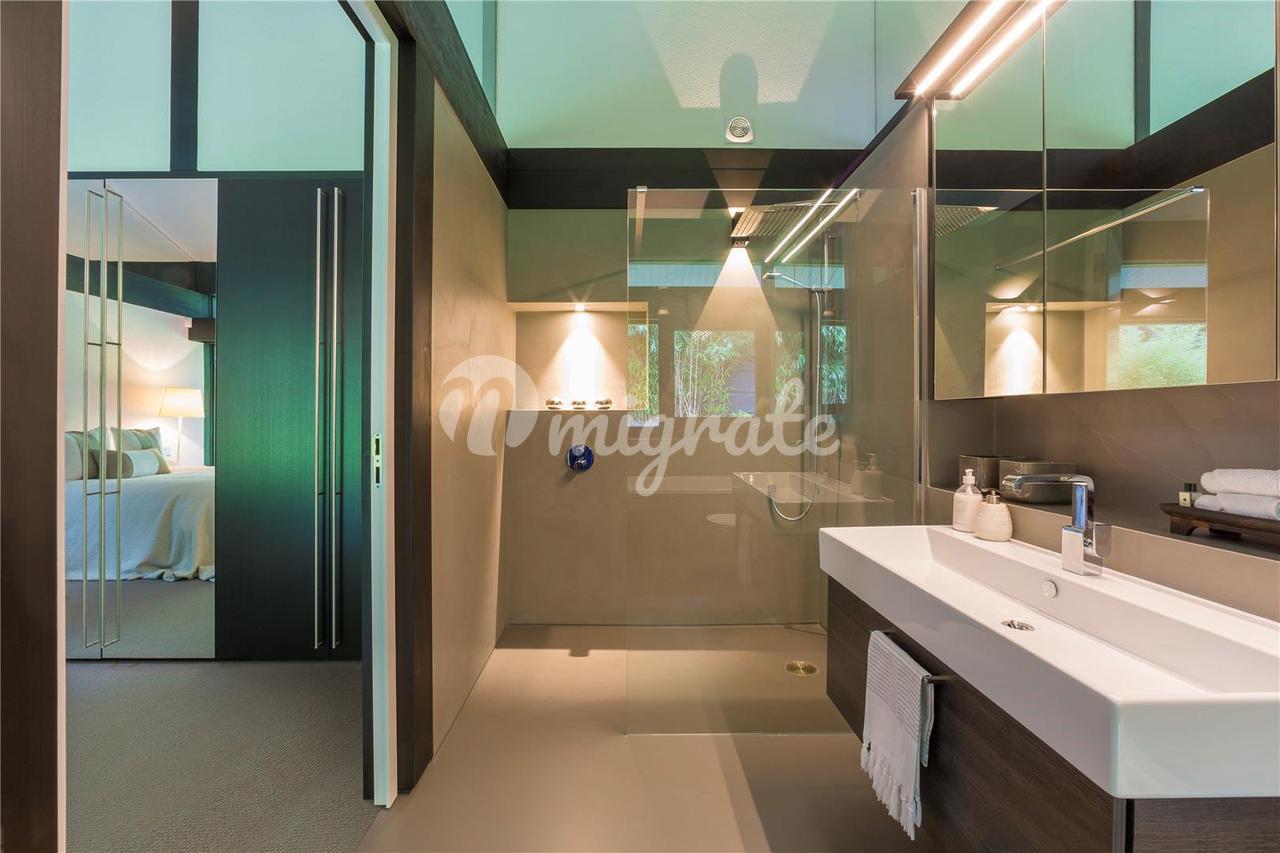 Главный вход проходит через красивый дзен-сад с впечатляющими садовыми скульптурами. Просторная прихожая ведет в сенсационную семейную кухню-столовую открытой планировки с большим островом. Главная приемная выходит на очаровательную утреннюю террасу. Существует также душевая и две спальни на первом этаже, а также тренажерный зал/кабинет, гардероб и прачечная. На первый этаж ведет плавающая лестница со вспомогательной кухней/столовой открытой планировки во всю ширину, которая имеет собственный вход по лестнице и отдельный вход, а также третью палубу. В главной спальне есть просторная ванная комната и собственный балкон. Есть еще три спальни (одна с ванной) и семейная душевая.