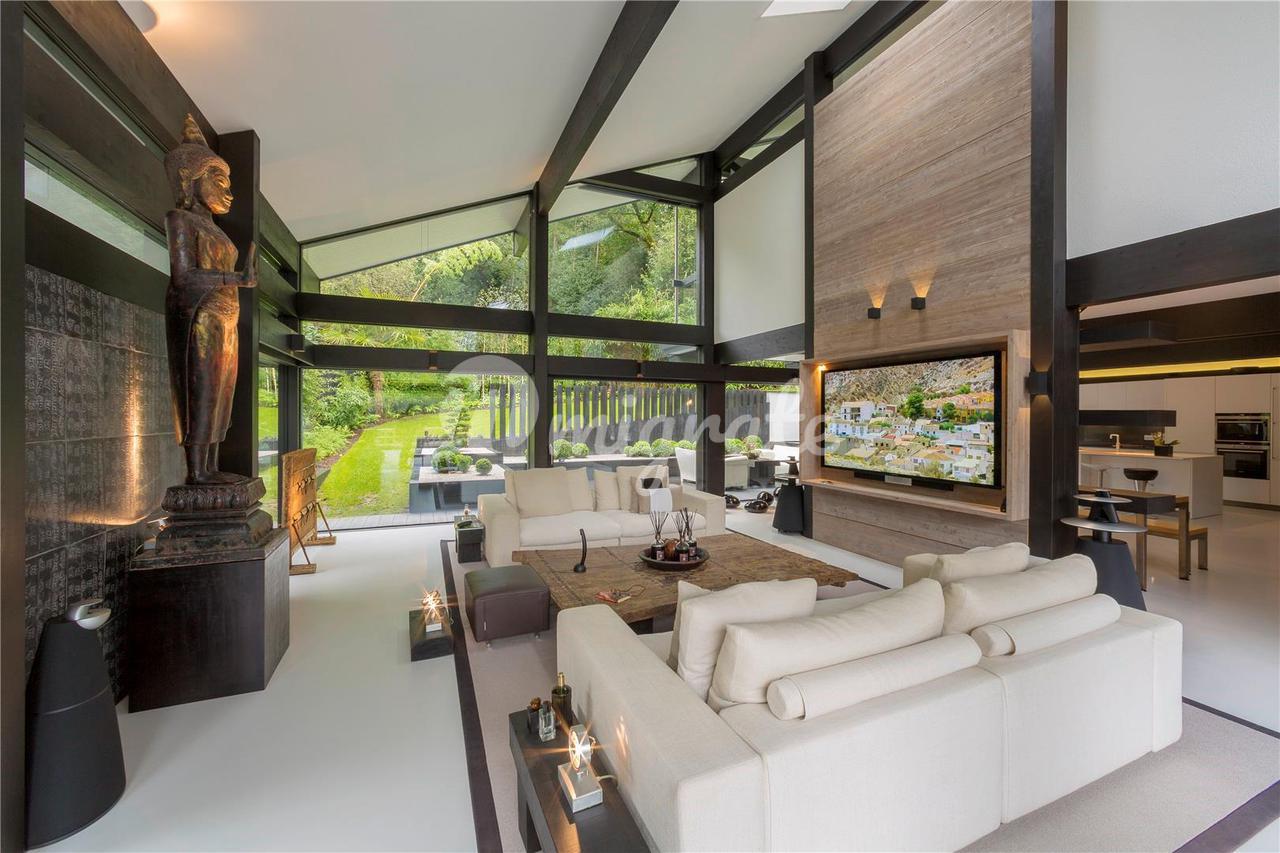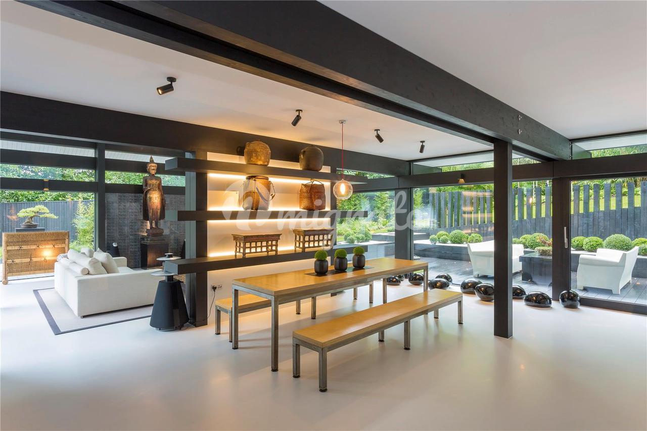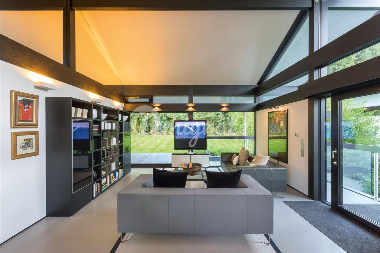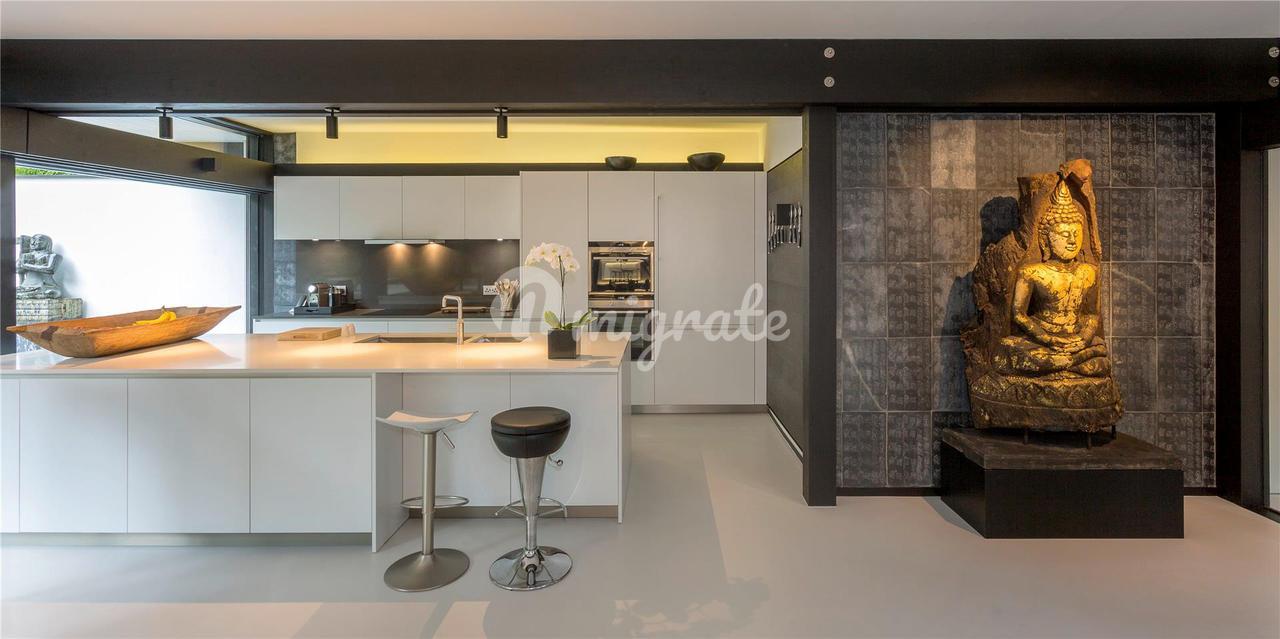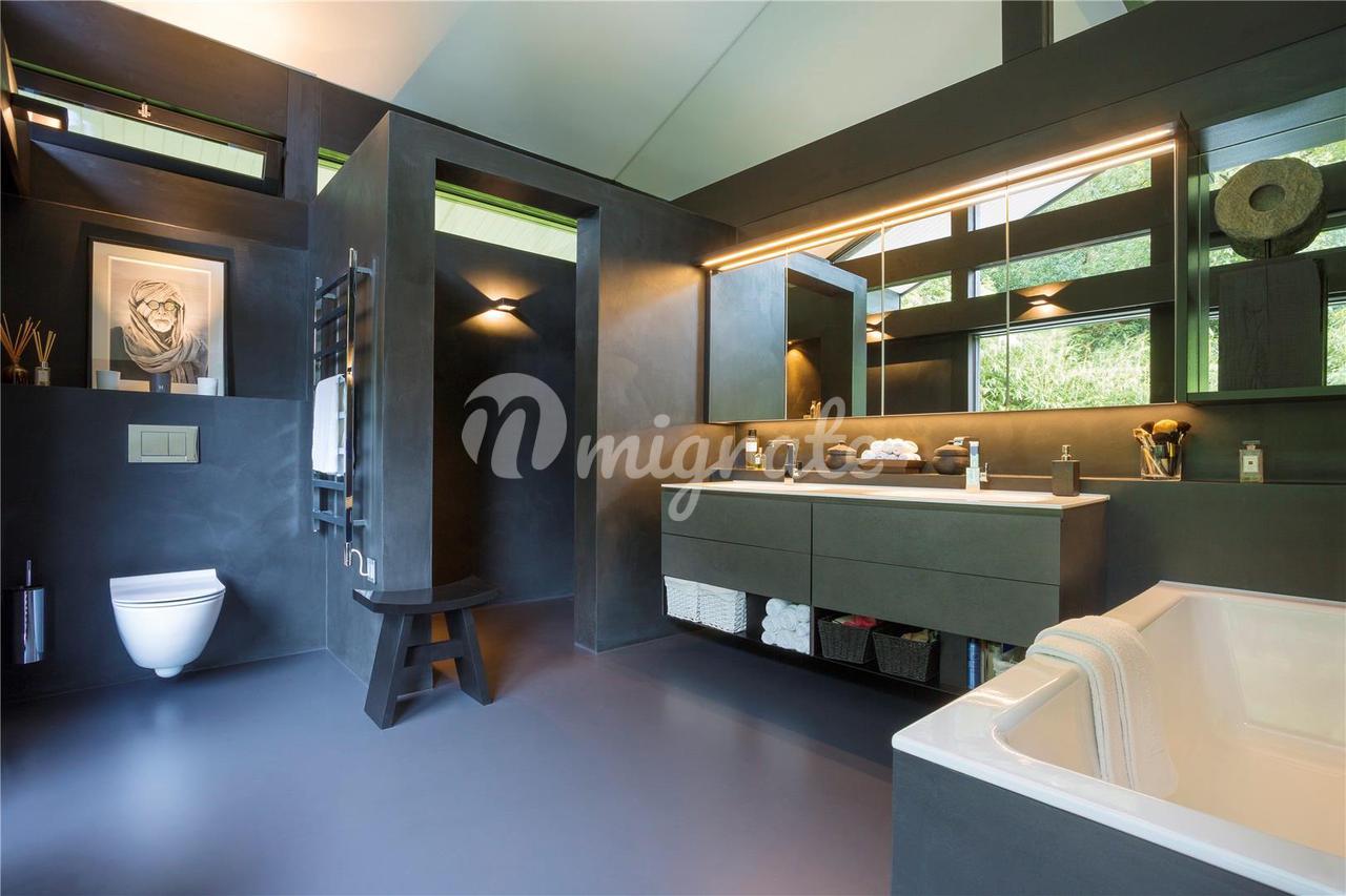 Главный вход проходит через красивый дзен-сад с впечатляющими садовыми скульптурами. Просторная прихожая ведет в сенсационную семейную кухню-столовую открытой планировки с большим островом. Главная приемная выходит на очаровательную утреннюю террасу. Существует также душевая и две спальни на первом этаже, а также тренажерный зал/кабинет, гардероб и прачечная. На первый этаж ведет плавающая лестница со вспомогательной кухней/столовой открытой планировки во всю ширину, которая имеет собственный вход по лестнице и отдельный вход, а также третью палубу. В главной спальне есть просторная ванная комната и собственный балкон. Есть еще три спальни (одна с ванной) и семейная душевая.