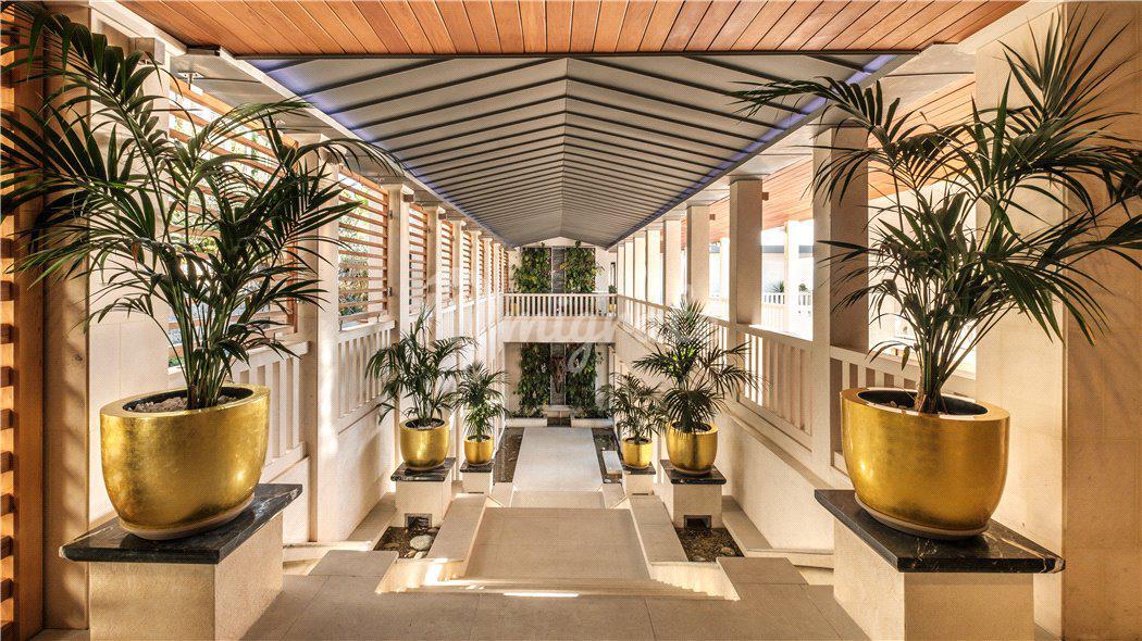 На территории ухоженных красивых садов площадью 11.000кв. м находится большой крытый двор с прудом кои и тропической живой стеной с водопадом, роскошный бассейн, бар, джакузи, террасы, обеденная зона, летняя кухня, комната для переодевания и ванная комната.