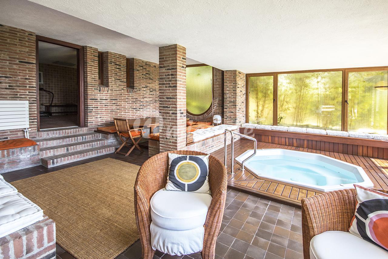 На цокольном этаже находится зона отдыха с джакузи, тренажерным залом и выходом в сад к бассейну.