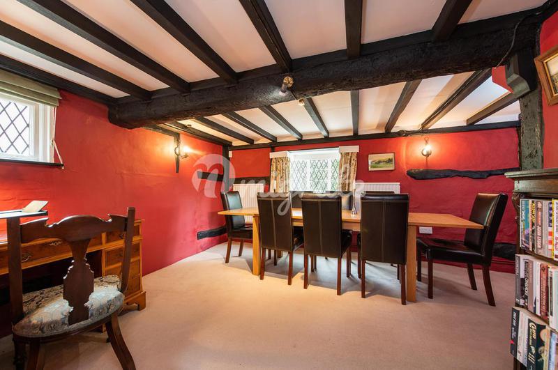 Передний фасад представляет собой типичный черно-белый коттедж в стиле шоколадной коробки с соломенной крышей и эркерами на первом этаже. В этом доме, внесенном в список памятников архитектуры II степ