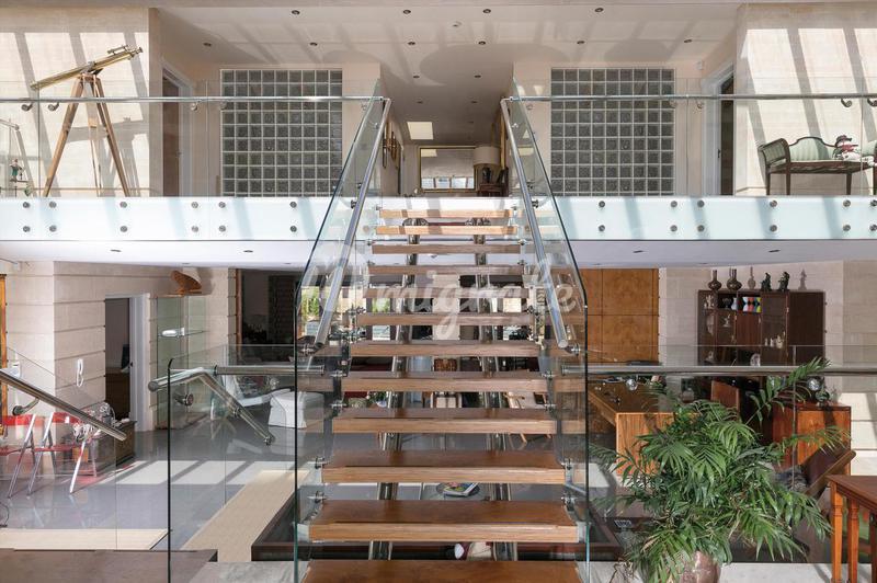 Войти в собственность можно через вестибюль с лестницей, поднимающейся на второй этаж, и дверьми в основные приемные. Они включают в себя двухстороннюю гостиную со старинным камином, встроенными книжн