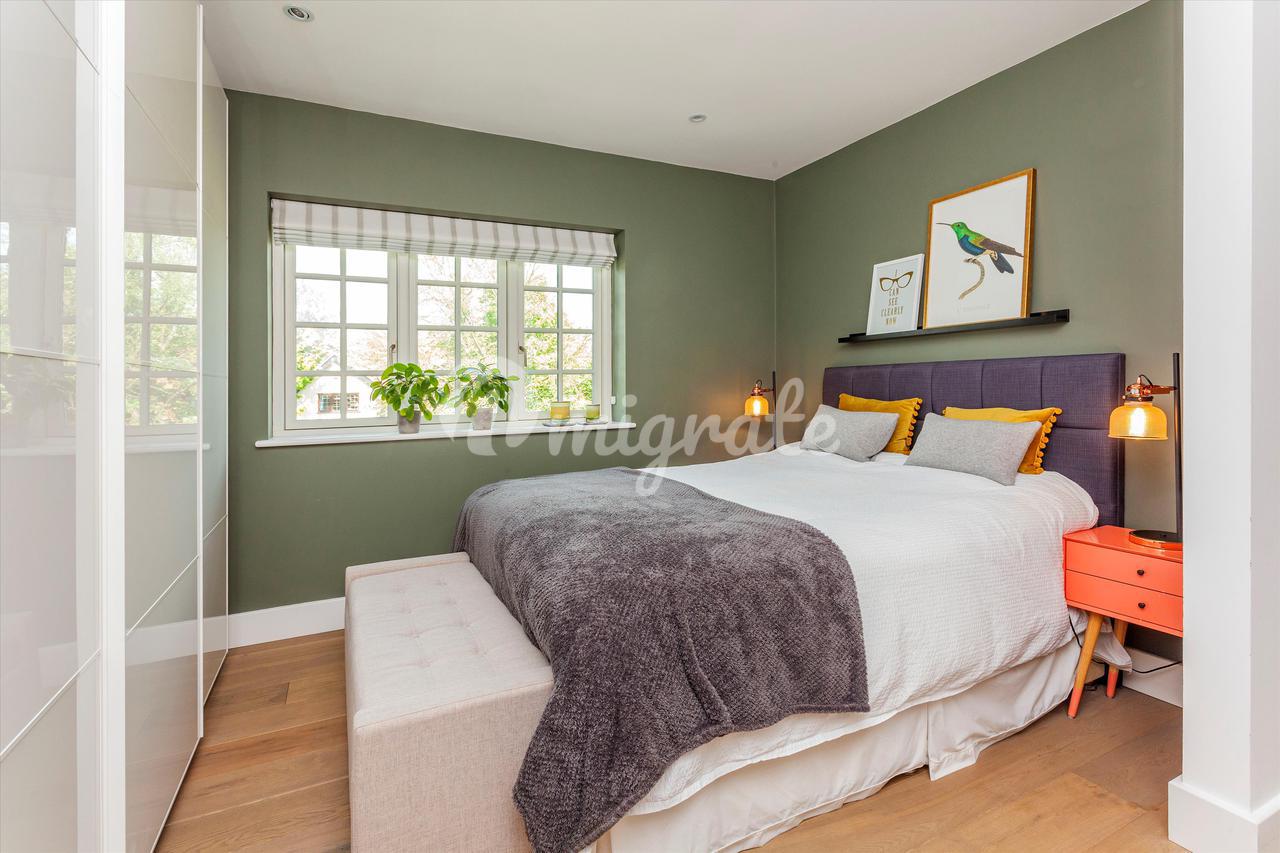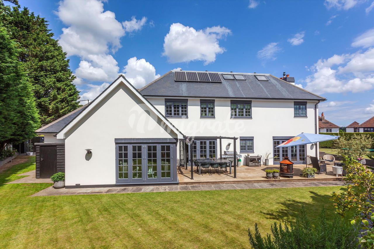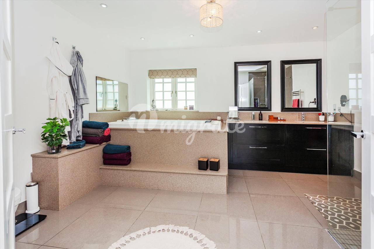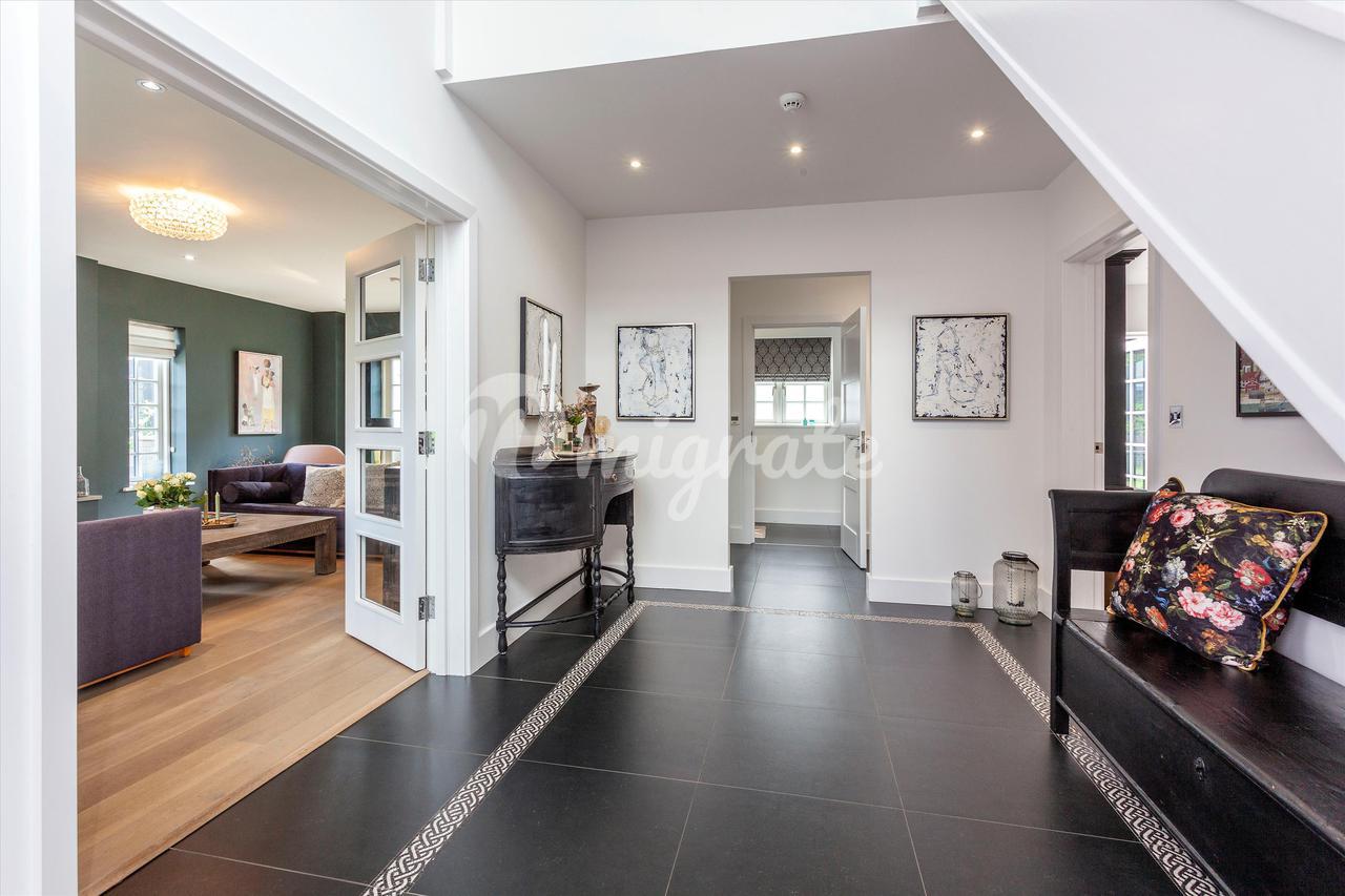 Входная дверь открывается во впечатляющую прихожую двойной высоты, которая обеспечивает доступ к основным комнатам приема и кухне / комнате для завтрака. Существует также отдельная гардеробная с туалетом. Кухня открытого плана / зал для завтрака является особенностью дома. Сделанная на заказ кухня была полностью оснащена привлекательным ассортиментом навесных и тумб от известных краснодеревщиков Rencraft. Существует также центральный остров вместе с рядом встроенных приборов под гранитными столешницами. Подсобное помещение также было оборудовано шкафами Rencraft с доступом к передней части здания. Зал для завтрака представляет собой идеальное место для более неформальной трапезы с двойными дверями, ведущими на террасу и в сад, а также с выходом к встроенному гаражу на две машины. К нему примыкает семейный номер с дальнейшим выходом в сад через двойные двери с обеих сторон. Трехсторонняя гостиная больших размеров с двойными дверями, ведущими в сад, завершающий размещение на первом этаже. На первом этаже главная спальня со встроенными шкафами, а также ванная комната с двойной раковиной, отдельной ванной и душевой кабиной. Во втором люксе имеется полностью оборудованная гардеробная, ведущая в душевую комнату. Есть еще две спальни с двуспальными кроватями, а также семейная ванная комната. На втором этаже есть еще две спальни с сантехникой, чтобы создать дополнительную спальню с ванной комнатой.