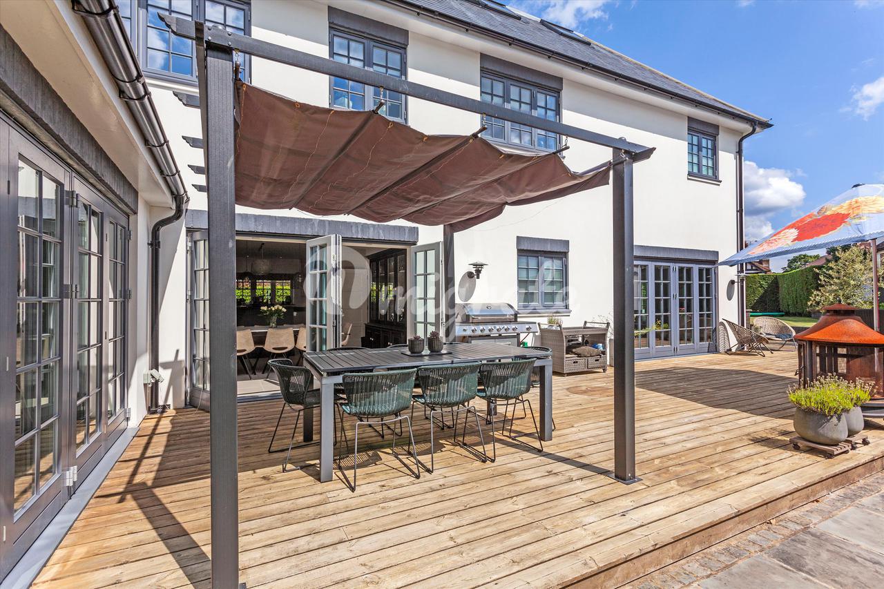 С внешней стороны к дому можно подъехать через ворота с электроприводом, ведущие на асфальтированную дорогу с парковкой на несколько автомобилей. Существует также встроенный отдельный гараж на две машины с автоматическими воротами. Перед домом есть зрелая изгородь, обеспечивающая ощущение уединения. Есть также полезные одиночные ворота, обеспечивающие дальнейший доступ. Круглый сад в основном состоит из лужайки со смесью зрелой живой изгороди и приподнятых клумб, примыкающих к деревянному ограждению, что создает легкую в уходе среду. Большая терраса с беседкой, на которую можно попасть из всех основных приемных, представляет собой идеальное место для развлечений на свежем воздухе. Есть также два полезных хранилища, незаметно расположенных сбоку от подъездной дорожки.