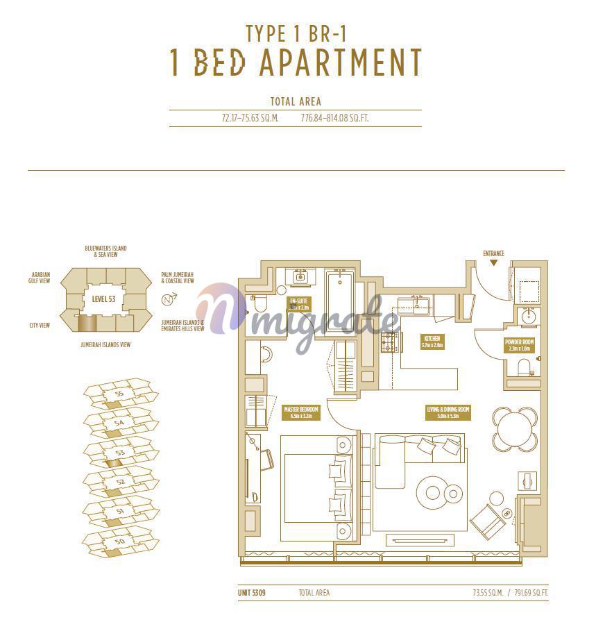 Жилые резиденции класса люкс занимают 48–73 этажи, что обеспечивает панорамный вид на море, соседнее комьюнити вилл с озерами и знаменитое колесо обозрения Ain Dubai.