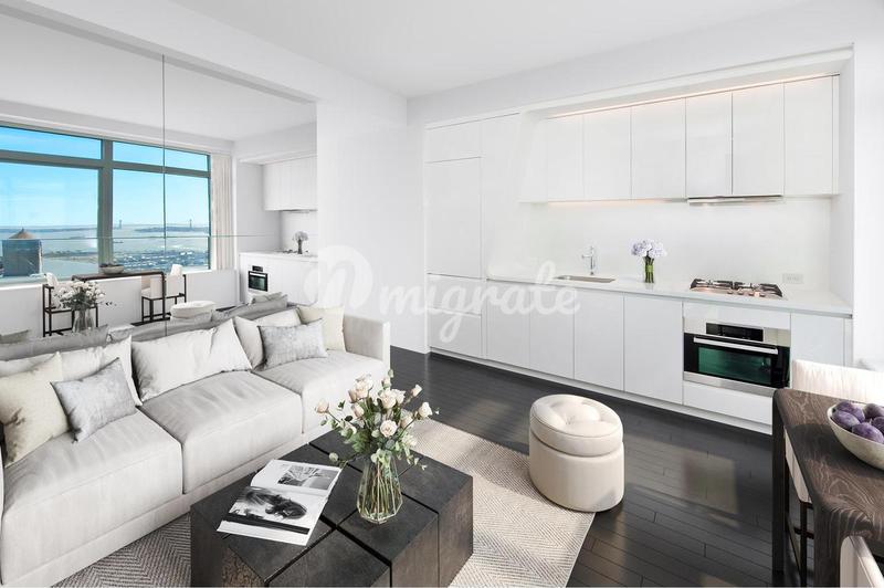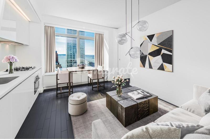 Светлые апартаменты расположены в финансовом районе Нью-Йорка, на 47 этаже высотного здания. Апартаменты открывают прекрасные виды на мост Верразано, гавань Нью-Йорка и Статую Свободы. Апартаменты пло