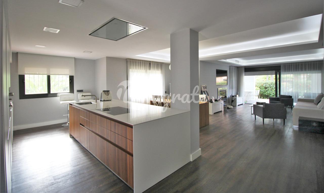 Недвижимость была отремонтирована и теперь предлагает прихожую с гостевым туалетом, просторную гостиную / столовую с настоящим камином и кухню Bulthaup открытой планировки с подсобным помещением, центральный остров, оборудованный бытовой техникой Gaggenau и Siemens, выход на крытую веранду с настилом. и далее частный сад. Справа от гостиной расположены три спальни-сьют, две из них выходят на южную террасу и в сад. В главных спальнях есть встроенная ванная комната с душем и ванной, а также две гардеробные.