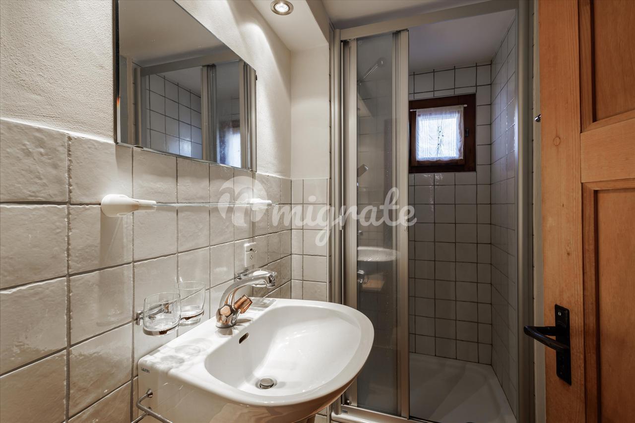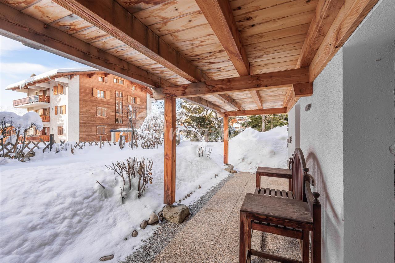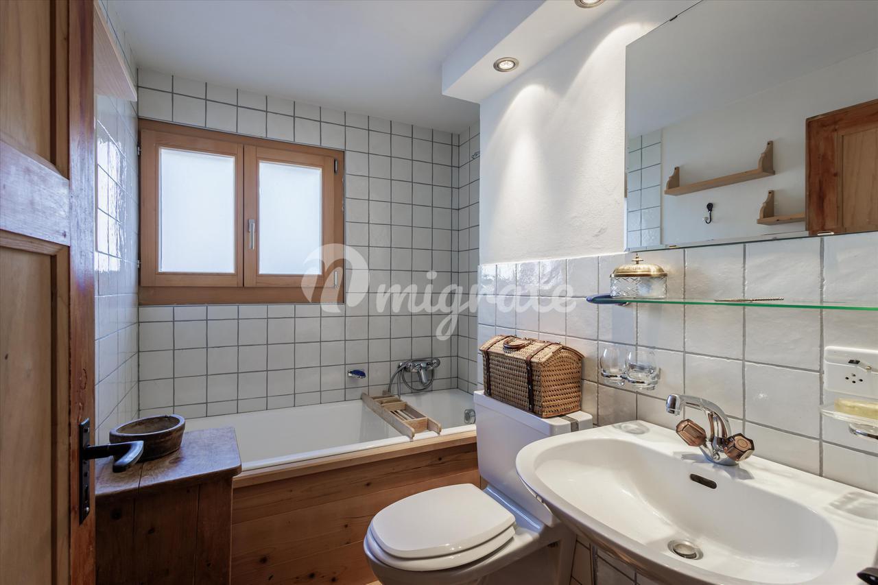Шале расположено на трех этажах, с основной жилой зоной на верхнем уровне. В нем есть светлая гостиная с камином, прямой выход на террасу с видом на окружающие горы, а также кухня открытой планировки, бар и столовая. Как на первом, так и на втором этажах есть две спальни и две ванные комнаты, а в шале также есть гараж на одну машину и два открытых парковочных места.