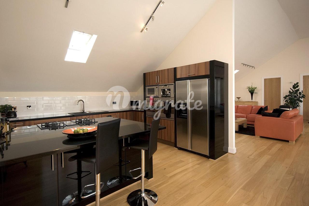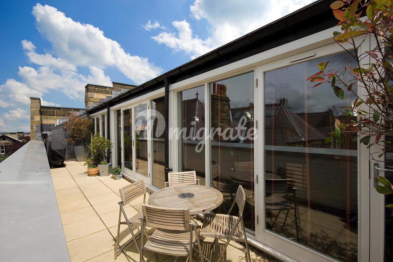 Есть три отличительные зоны: зона отдыха, столовая и кухня. Это великолепное жилое пространство имеет террасу, выходящую на запад, на которую можно попасть через 3 пары двойных французских дверей. Также есть кабинет, подсобное помещение и гардероб. На уровне третьего этажа также есть отличное хранилище с тремя специализированными магазинами.