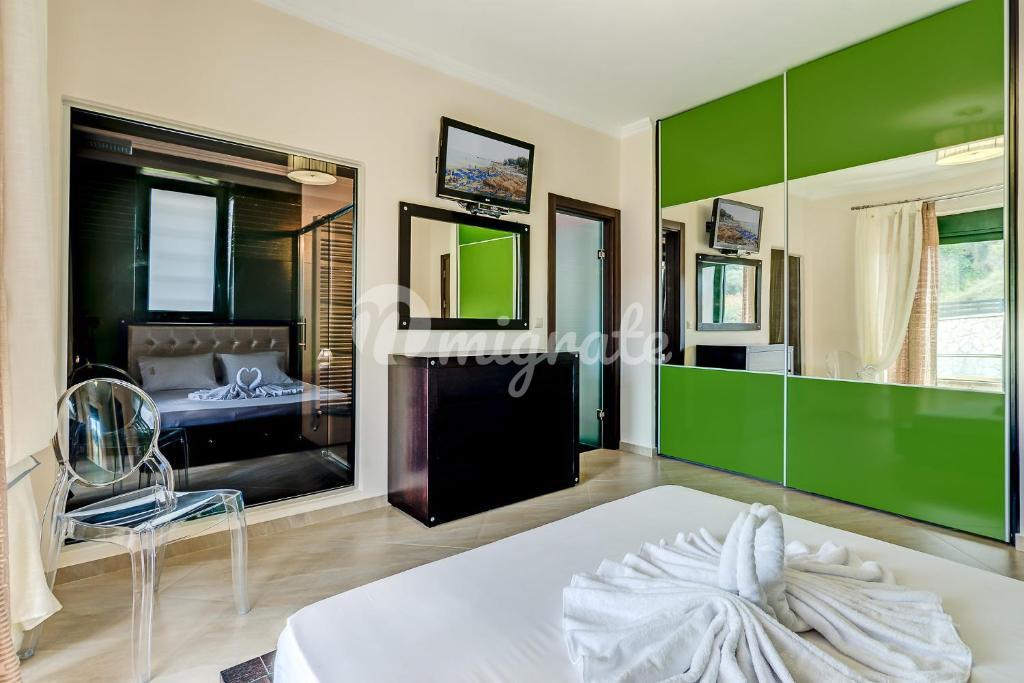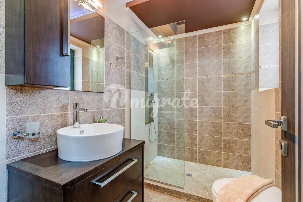 На первом этаже находятся просторная гостиная с обеденной зоной и современной кухней, а также ванная комната с душевой комнатой. Мраморная лестница ведет на второй этаж, где расположены 3 спальни, одна из них с собственной ванной комнатой. Также на этом этаже находится общая большая ванная комната. Все 3 спальни имеют выход на террасы с видом на море, горы или виноградники. Цокольный этаж представляет собой отдельные апартаменты с гостиной, кухней, спальней, 2-мя санузлами, помещением со стиральной машиной и отдельным входом.